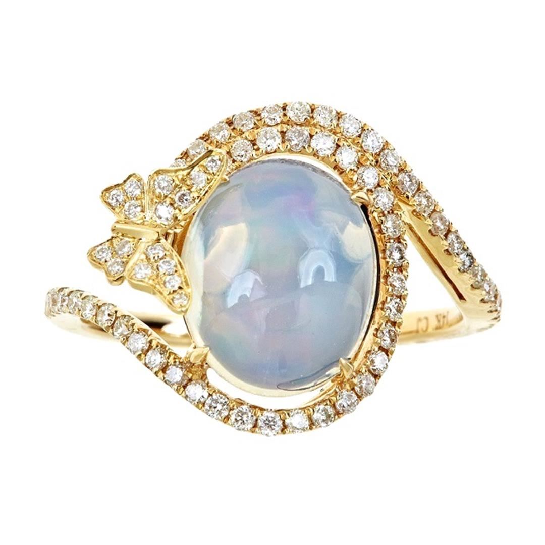 One Ethiopian Opal and Diamond Ring featuring: 14KT Yellow Gold with a total weight of 3.09 grams, Ethiopian Opal with a total weight of 2.29ct and 70 Diamonds with a total weight of 0.41ctw.