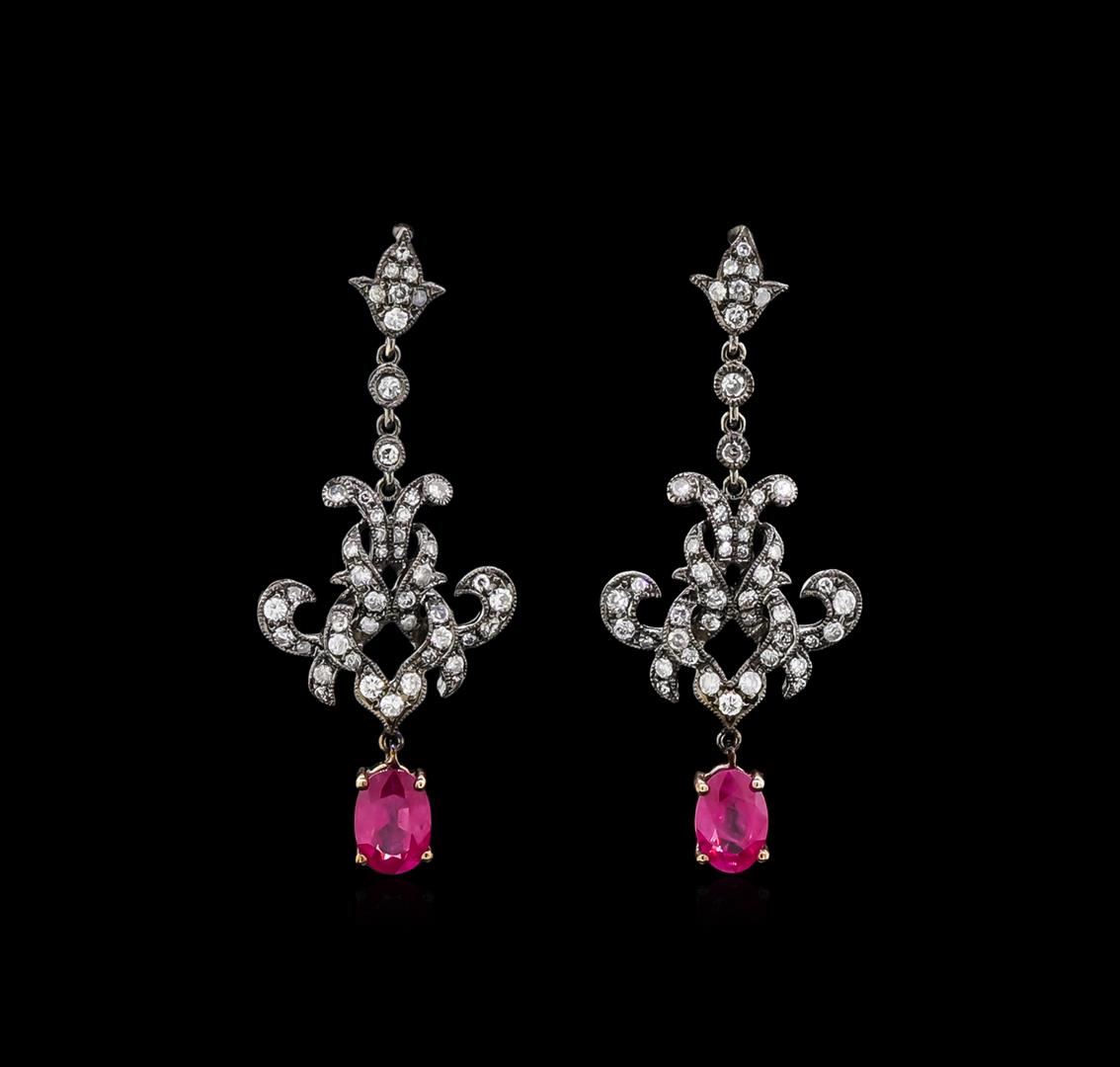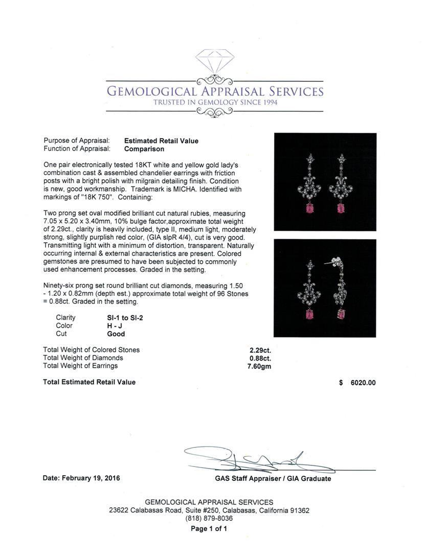 One pair electronically tested 18KT white and yellow gold lady's combination cast & assembled chandelier earrings with friction posts with a bright polish with milgrain detailing finish. Trademark is MICHA. Identified with markings of "18K 750". Condition is new, good workmanship. Containing: Two prong set oval modified brilliant cut natural rubies, measuring 7.05 x 5.20 x 3.40mm, 10%. bulge factor, approximate total weight of 2.29ct., clarity is heavily included, type II, medium light, moderately strong, slightly purplish red color, (GIA slpR 4/4), cut is very good. Transmitting light with a minimum of distortion, transparent. Naturally occurring internal & external characteristics are present. Colored gemstones are presumed to have been subjected to commonly used enhancement processes. Graded in the setting. Ninety-Six prong set round brilliant cut diamonds, measuring 1.50 - 1.20 x 0.82mm (depth est.) approximate total weight of 96 Stones = 0.88ct. Graded in the setting. Clarity: SI-1 to SI-2. Color: H - Good. Total Weight of Colored Stones 2.29ct. Total Weight of Diamonds 0.88ct. Total Weight of Earrings 7.60gm. GAS Appraised at $6,020.00.