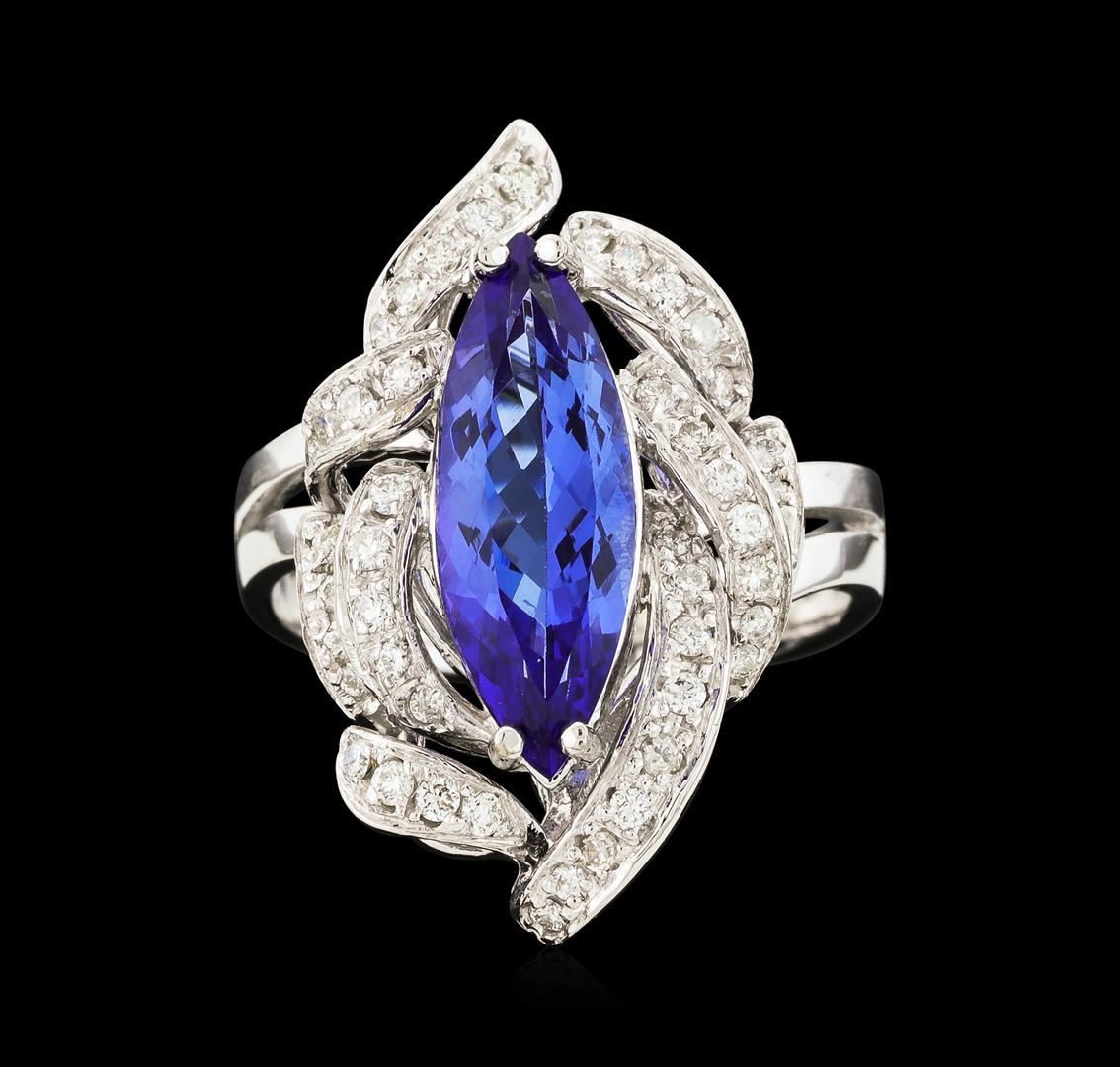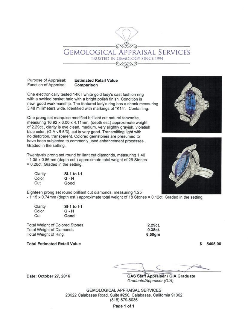 One electronically tested 14KT white gold lady's cast fashion ring with a swirled basket halo with a bright polish finish. The featured lady's ring has a shank measuring 3.48 millimeters wide. Identified with markings of 'K14'. Condition is new, good workmanship. Containing: One prong set marquise modified brilliant cut natural tanzanite, measuring 16.92 x 6.00 x 4.11mm, (depth est.) approximate weight of 2.29ct., clarity is eye clean, medium, very slightly grayish, violetish blue color, (GIA vB 5/3), cut is very good. Transmitting light with no distortion, transparent. Colored gemstones are presumed to have been subjected to commonly used enhancement processes. Graded in the setting. Twenty-Six prong set round brilliant cut diamonds, measuring 1.40 - 1.35 x 0.86mm (depth est.) approximate total weight of 26 Stones = 0.26ct. Graded in the setting. Clarity SI-1 to I-1. Color: G - H Cut Good Eighteen prong set round brilliant cut diamonds, measuring 1.25 - 1.15 x 0.74mm (depth est.) approximate total weight of 18 Stones = 0.12ct. Graded in the setting. Clarity SI-1 to I-1. Color: G - H Cut Good. Total Weight of Colored Stones 2.29ct.. Total Weight of Diamonds 0.38ct.. Total Weight of Ring 6.50gm.