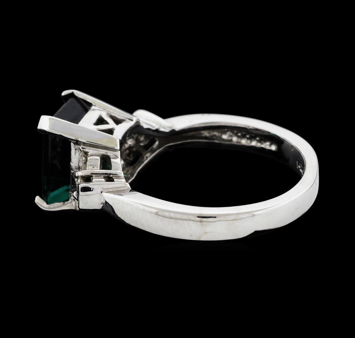 One electronically tested 14KT white gold lady's cast fashion ring with a cathedral shank with a bright polish finish. The featured lady's ring has a shank measuring 2.68 millimeters wide. Identified with markings of '14K'. Condition is new, good workmanship. Containing: One prong set emerald standard step cut natural blue/green tourmaline, measuring 9.52 x 7.16 x 4.07mm, (depth est.) approximate weight of 2.29ct., clarity is eye clean, medium dark, moderately strong, bluish green color, (GIA bG 6/4), cut is very good. Transmitting light with no distortion, transparent. Colored gemstones are presumed to have been subjected to commonly used enhancement processes. Graded in the setting. Six prong set round brilliant cut diamonds, measuring 2.70 - 2.60 x 1.59mm (depth est.) approximate total weight of 6 Stones = 0.41ct. Graded in the setting. Clarity SI-1 to I-1. Color: H - I Cut Good. Total Weight of Colored Stones 2.29ct.. Total Weight of Diamonds 0.41ct.. Total Weight of Ring 5.70gm. GAS Appraised at $3,100.00.