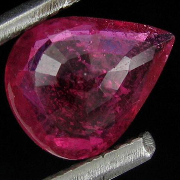 Excellent blood red colored specimen pear cut; lab quality evaluation 8; treatment as noted; Gem Guide wholesale $2750-$4400; full retail appraisal $17938; full lab evaluation available