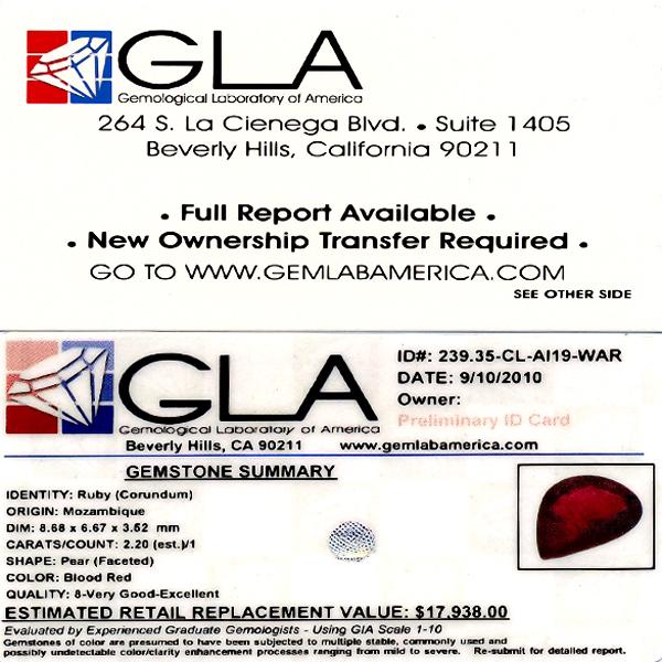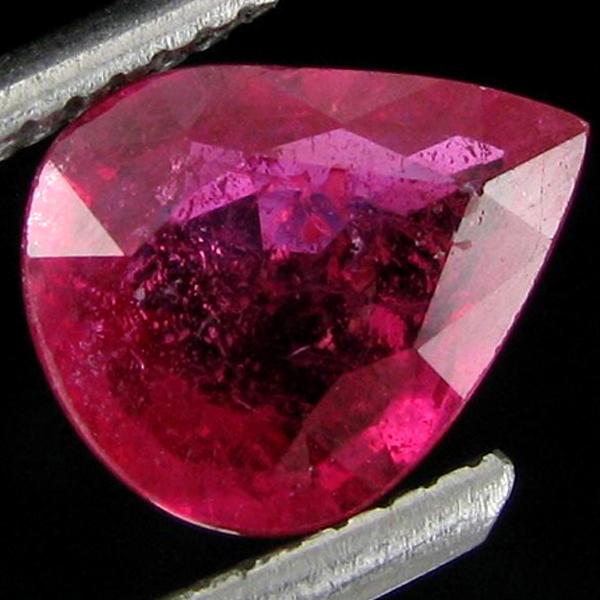 Excellent blood red colored specimen pear cut; lab quality evaluation 8; treatment as noted; Gem Guide wholesale $2750-$4400; full retail appraisal $17938; full lab evaluation available