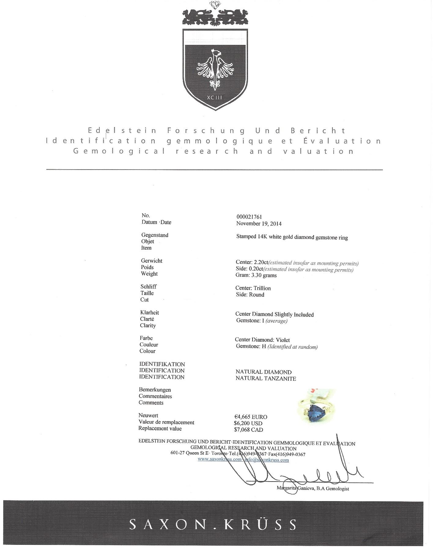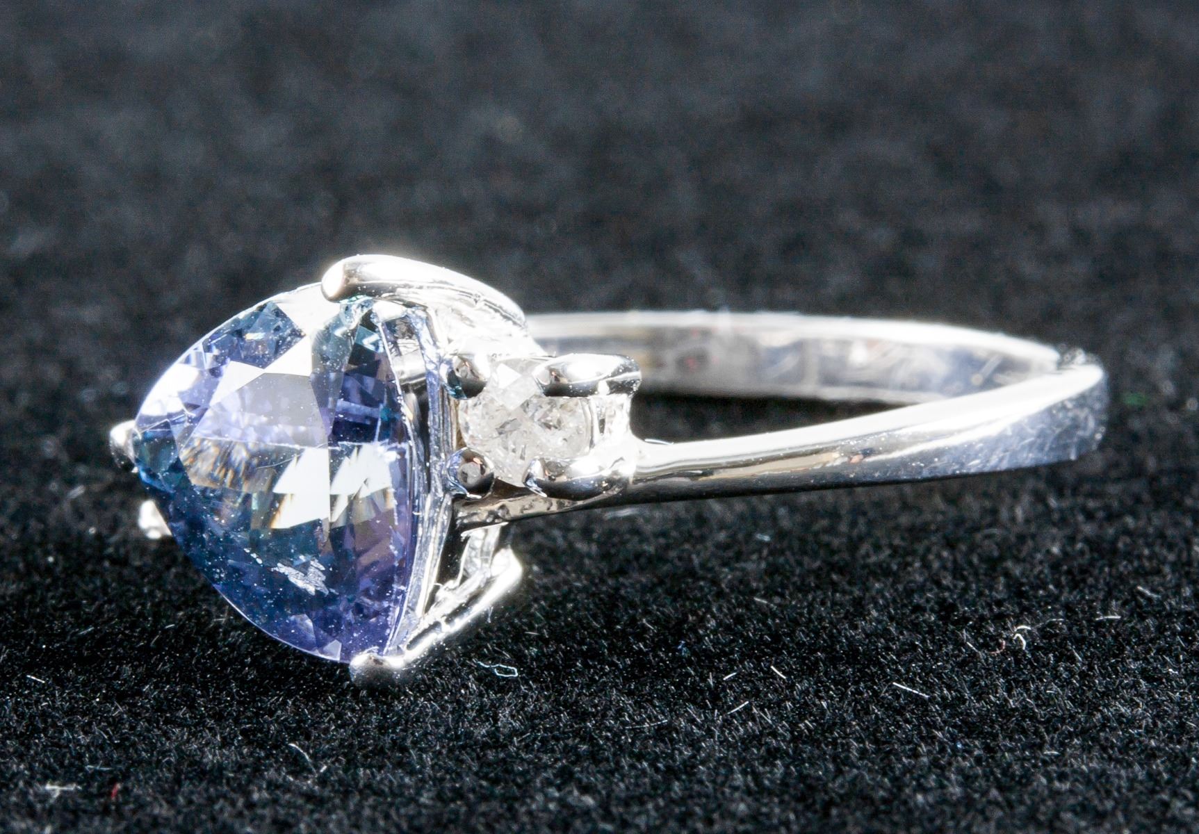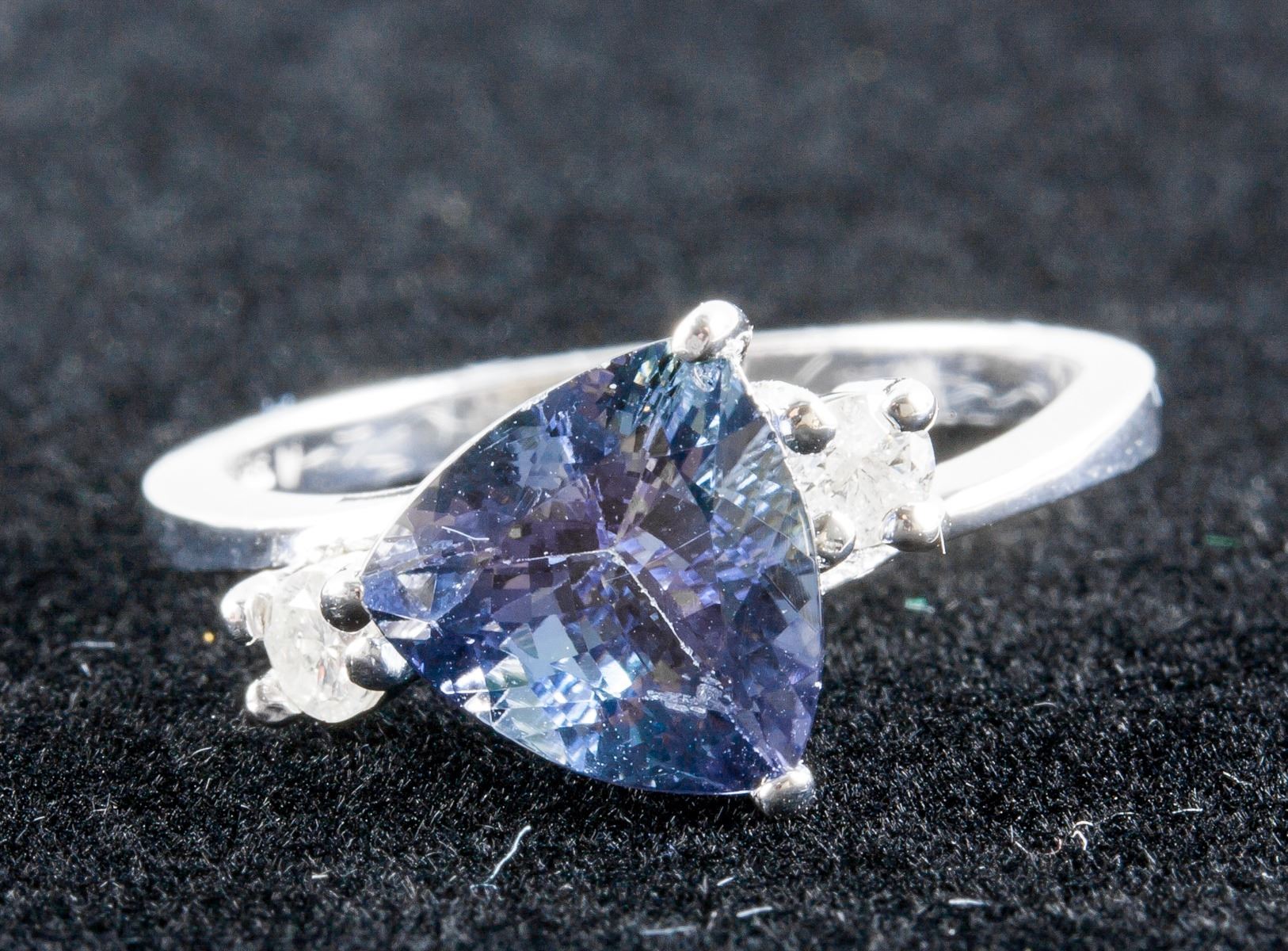 Stamped 14k white gold ring. Set with 2.20ct, trillion cut, slightly included, violet colored tanzanite with 0.20ct round cut, I clarity and H colored diamond. Certified replacement value $7068. 3.30 grams.