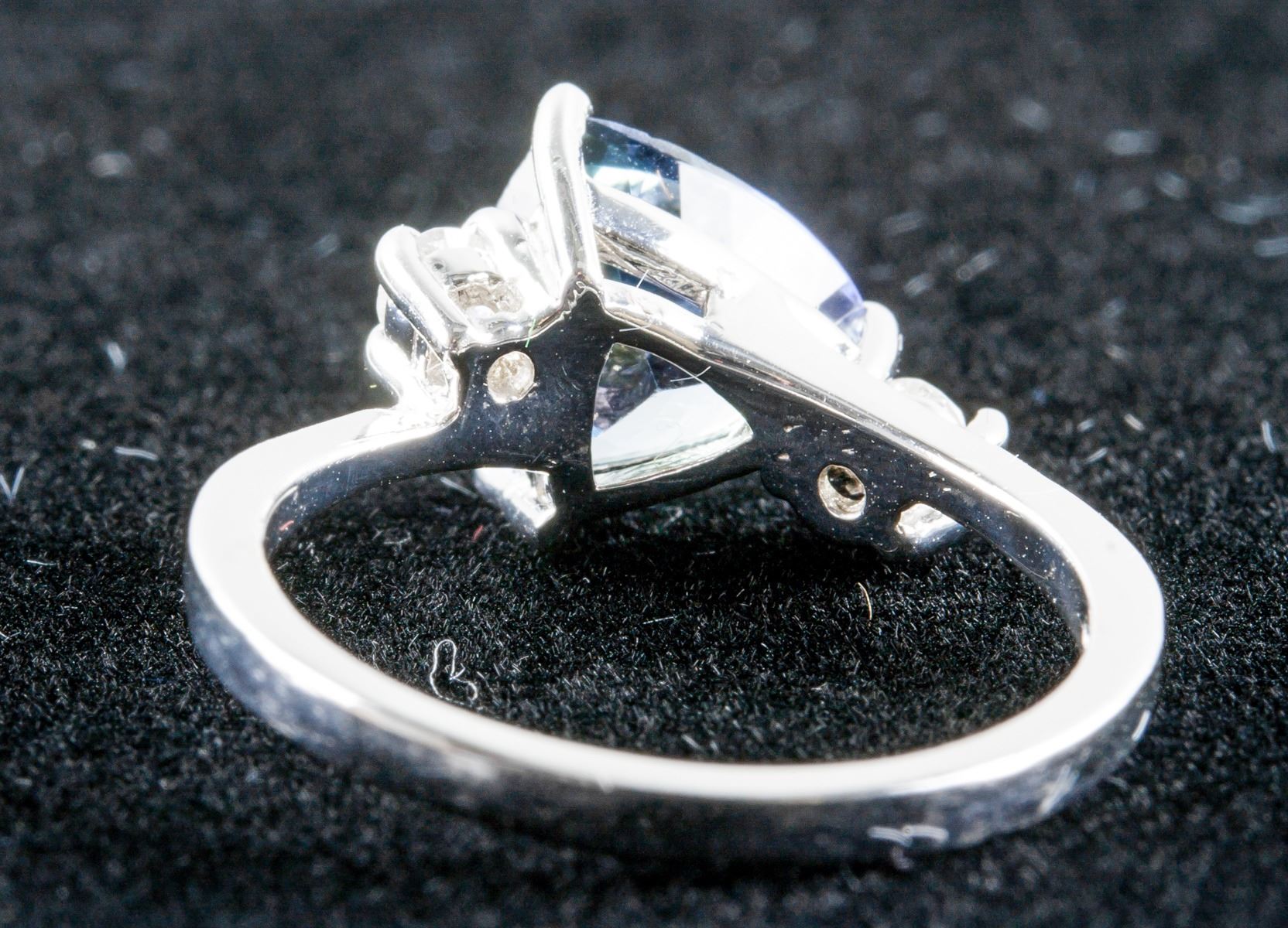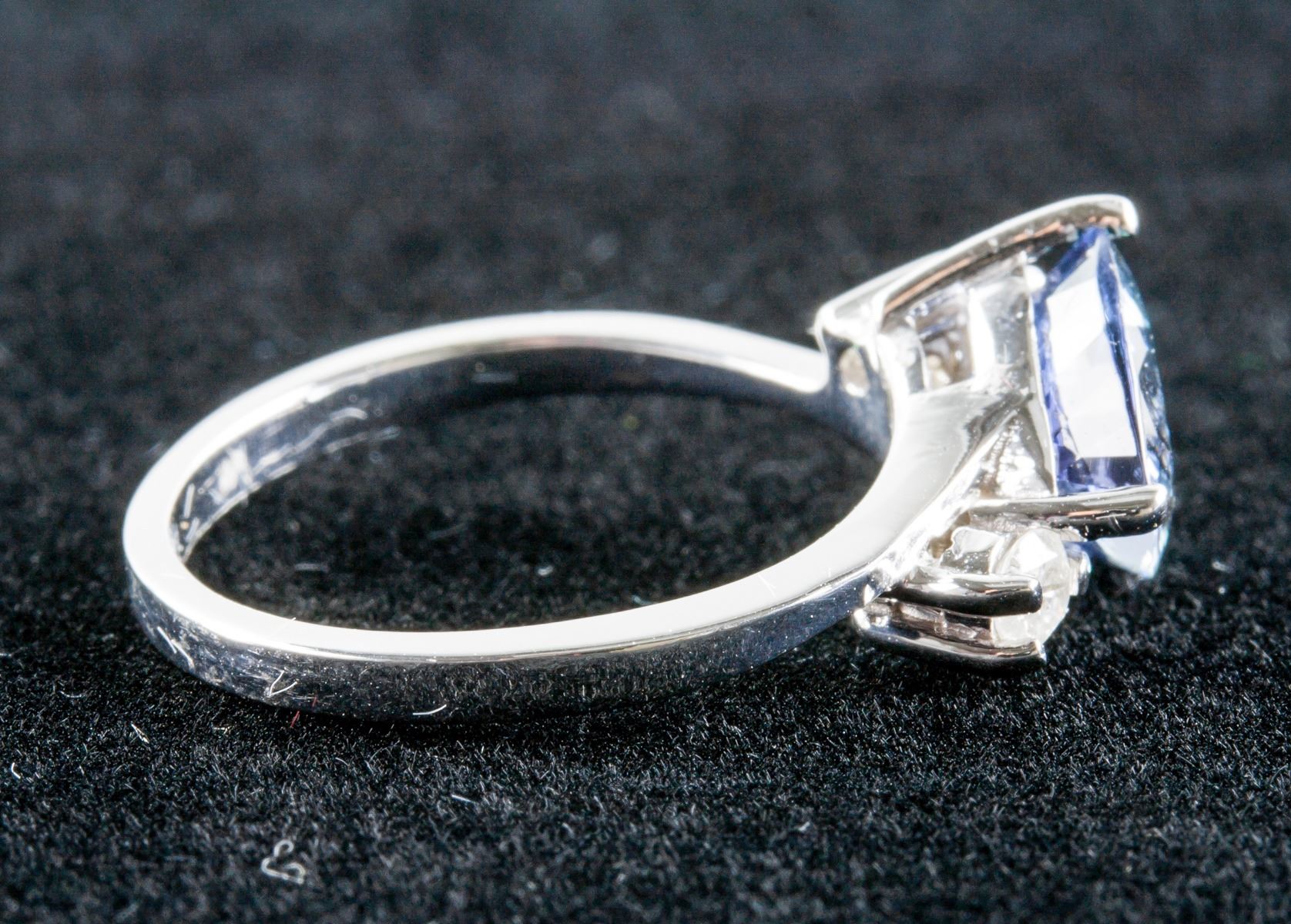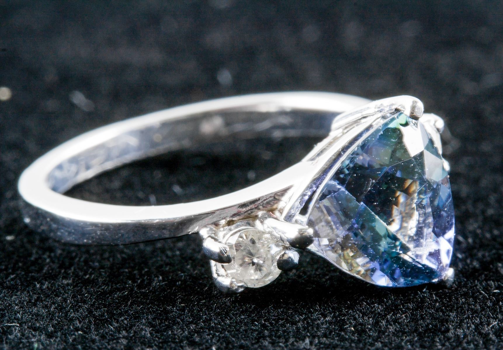 Stamped 14k white gold ring. Set with 2.20ct, trillion cut, slightly included, violet colored tanzanite with 0.20ct round cut, I clarity and H colored diamond. Certified replacement value $7068. 3.30 grams.
