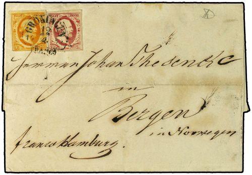 2,3 1852 LA HAYA a BERGEN (Noruega). 10 cts. rojo y 15 cts. amarillo. Rara destinación.