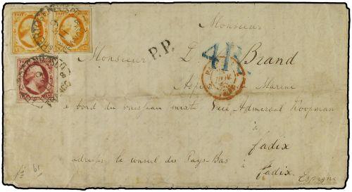 2,3(2) 1858 HERTOGENROSCH a CADIZ (España). 10 cts. rojo y 15 cts. amarillo (2). Porte parcial hasta la frontera, marca P.P. y tasa de 4 reales estampada a la llegada a España. Envuelta algo frágil y con algunas roturas, sellos en perfecto estado. Muy rara destinación a España en la primera emisión.
