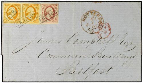2,3(2) 1863 ROTTERDAM a BELFAST (Irlanda). 10 cts. carmín y 15 cts. amarillo (2). MAGNIFICA.