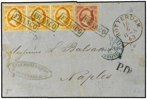 2,3(3) 1868 ROTTERDAM a NAPOLES (Italia). 10 cts. rojo y 15 cts. amarillo tira de tres. Muy rara destinación a Italia en la primera emisión.