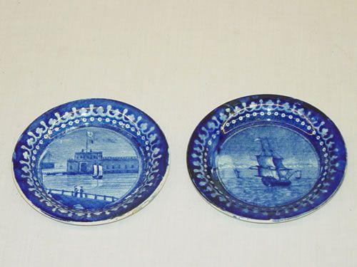(2) 3 3/4" BLUE STAFFORDSHIRE HISTORICAL CUP PLATES: (1) CASTLE GARDEN & (1) CADUMUS, BOTH BY WOODS