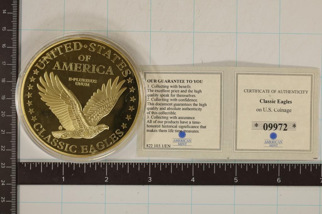 70MM DIAMETER IN PROOF QUALITY, 110 GRAMS. LIMITED EDITION OF 9999. THE OBVERSE IS LIBERTY HEAD DOUBLE EAGLE AND THE REVERSE IS CLASSIC EAGLES. IN HARD PLASTIC CAPSULE WITH CERTIFICATE IN PLASTIC SLEEVE.