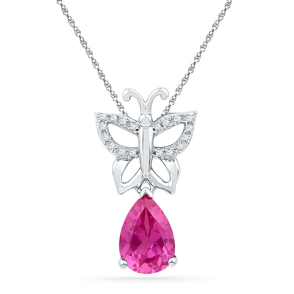 10kt White Gold Womens Pear Lab-Created Pink Sapphire Butterfly Bug Pendant 2-3/4 Cttw