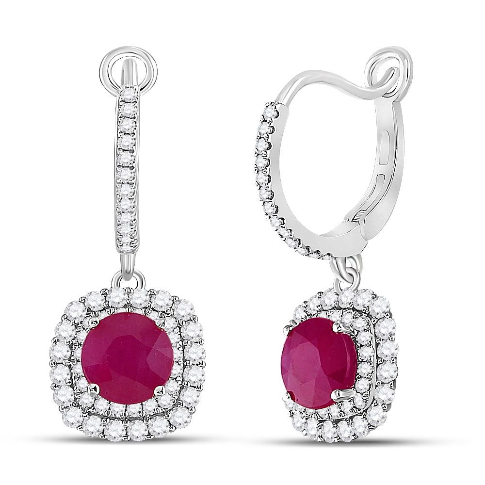 REF-92F3W - 2 & 3/4 CTW Womens Round Ruby Diamond Hoop Dangle Earrings 14kt Yellow Gold - REF-92F3W