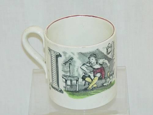 2 3/4" POLYCHROME STAFFORDSHIRE CHILDS TRANSFER MUG - I AND J. - FINE HAIRLINE;