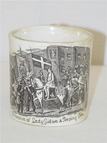 2 3/4" STAFFORDSHIRE CHILDS MUG-"PROCESSION OF LADY GODIVA & PEEPING TOM" - OLDER CHIP REPAIRS & STAINING