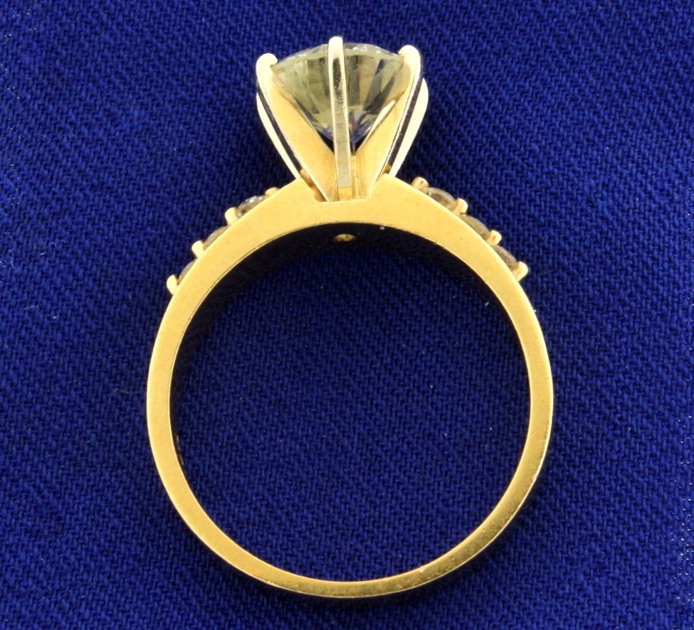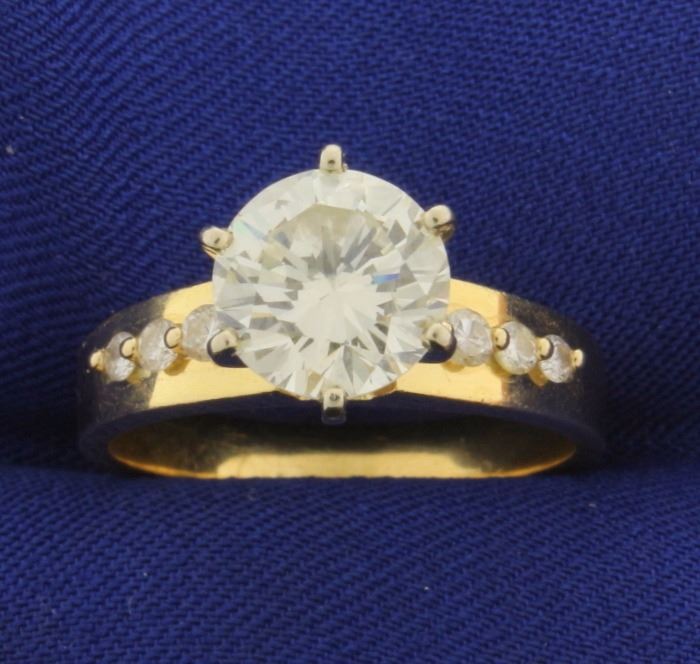 in 18k yellow gold. Center diamond is high quality 2.5ct diamond of VS2 clarity/L color with excellent cut for lots of sparkle and brilliance. Also contains 1/4ct TW of SI clarity/L color round diamonds in shank. Size 9 1/4. 7.7g.
