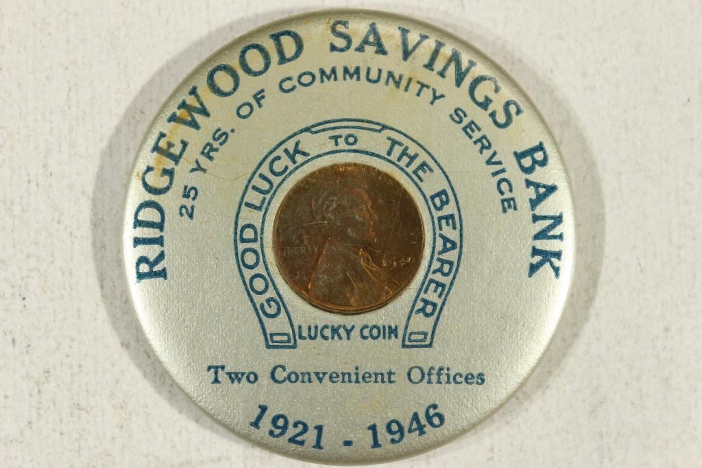 RIDGEWOOD SAVINGS BANK WITH UNC 1946 LINCOLN CENT