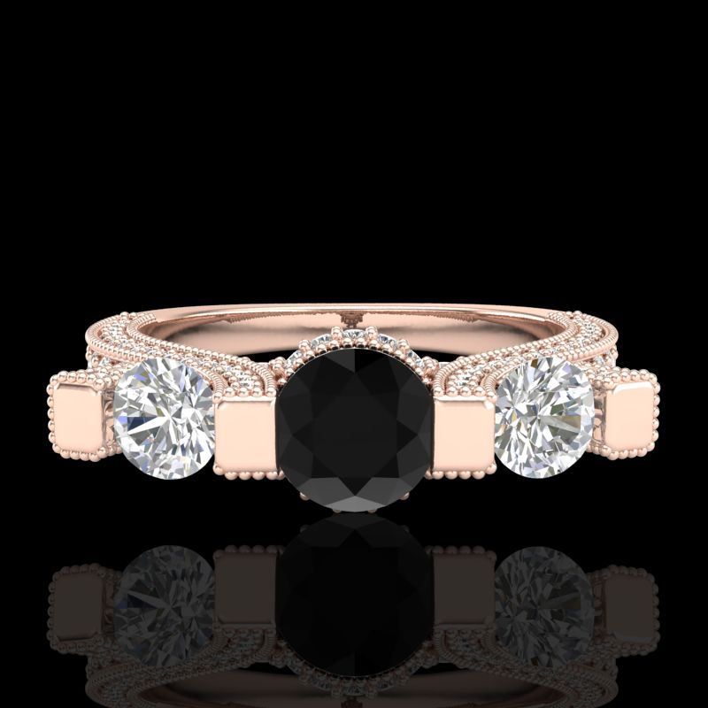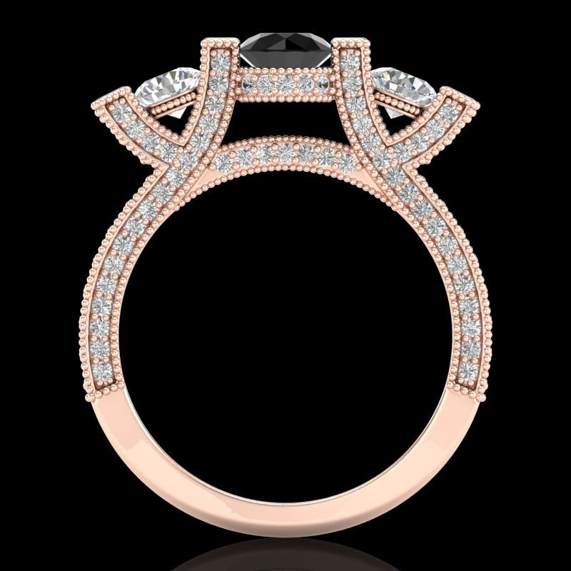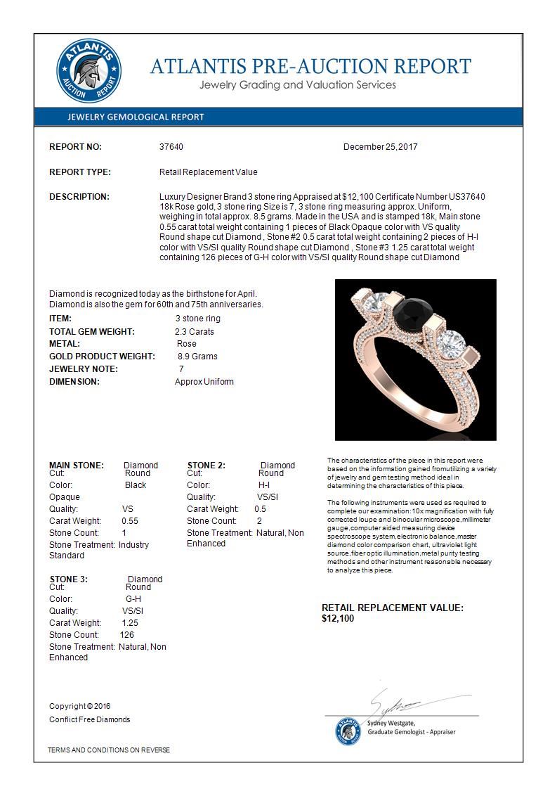 REF-200W2F -37640 ---- 2.3 CTW Fancy Black Diamond Solitaire Micro Pave 3 Stone Ring 18K Rose Gold ---- Luxury Designer Brand 3 stone ring Appraised at $12,100 Certificate Number US37640 18k Rose gold, 3 stone ring Size is 7, 3 stone ring measuring approx. Uniform, weighing in total approx. 8.5 grams. Made in the USA and is stamped 18k, Main stone 0.55 carat total weight containing 1 pieces of Black Opaque color with VS quality Round shape cut Diamond , Stone #2 0.5 carat total weight containing 2 pieces of H-I color with VS/SI quality Round shape cut Diamond , Stone #3 1.25 carat total weight containing 126 pieces of G-H color with VS/SI quality Round shape cut Diamond