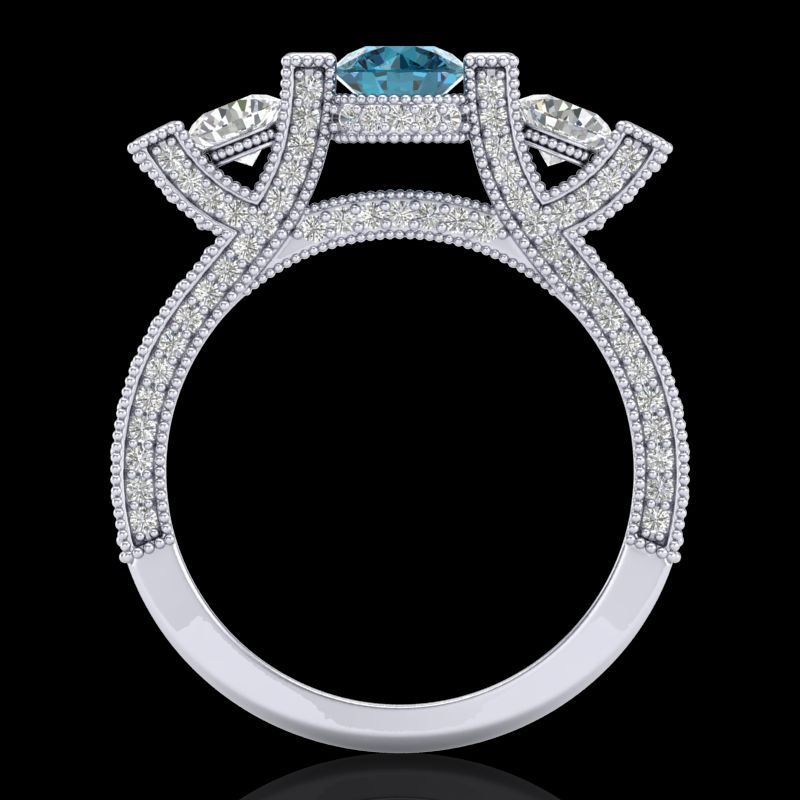 2.3 CTW Fancy Intense Blue Diamond Micro Pave 3 Stone Ring 18K White Gold ---- Luxury Designer Brand 3 stone ring Appraised Retail Price at $15,600 ---- SKU Number US37642 18k White gold 3 stone ring Size is 7, 3 stone ring measuring approx. Uniform, weighing in total approx. 8.5 grams. Made in the USA and is stamped 18k, Main stone 0.55 carat total weight containing 1 pieces of Intense Fancy Blue color with SI quality Round shape cut Diamond , Stone #2 0.5 carat total weight containing 2 pieces of H-I color with VS/SI quality Round shape cut