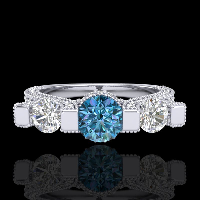 2.3 CTW Fancy Intense Blue Diamond Micro Pave 3 Stone Ring 18K White Gold ---- Luxury Designer Brand 3 stone ring Appraised Retail Price at $15,600 ---- SKU Number US37642 18k White gold 3 stone ring Size is 7, 3 stone ring measuring approx. Uniform, weighing in total approx. 8.5 grams. Made in the USA and is stamped 18k, Main stone 0.55 carat total weight containing 1 pieces of Intense Fancy Blue color with SI quality Round shape cut Diamond , Stone #2 0.5 carat total weight containing 2 pieces of H-I color with VS/SI quality Round shape cut