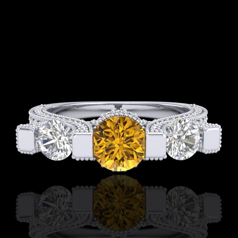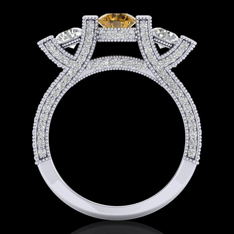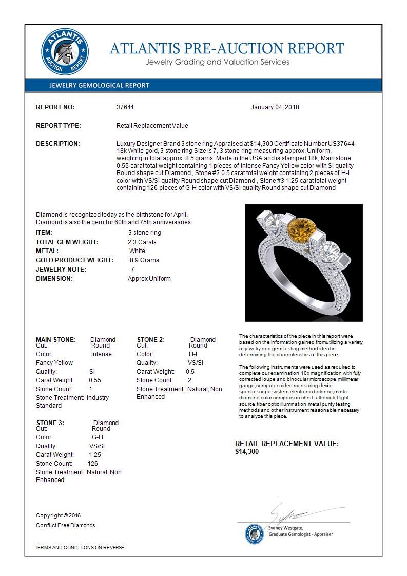 REF-236Y4K -37644 ---- 2.3 CTW Intense Fancy Yellow Diamond Micro Pave 3 Stone Ring 18K White Gold ---- Luxury Designer Brand 3 stone ring Appraised at $14,300 Certificate Number US37644 18k White gold, 3 stone ring Size is 7, 3 stone ring measuring approx. Uniform, weighing in total approx. 8.5 grams. Made in the USA and is stamped 18k, Main stone 0.55 carat total weight containing 1 pieces of Intense Fancy Yellow color with SI quality Round shape cut Diamond , Stone #2 0.5 carat total weight containing 2 pieces of H-I color with VS/SI quality Round shape cut Diamond , Stone #3 1.25 carat total weight containing 126 pieces of G-H color with VS/SI quality Round shape cut Diamond