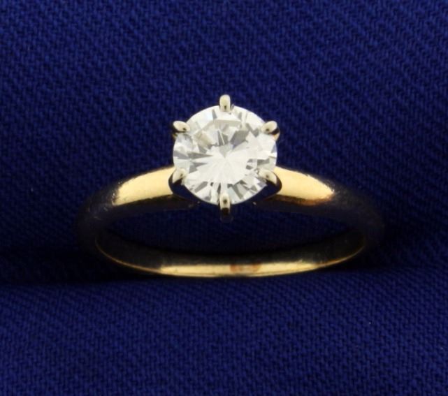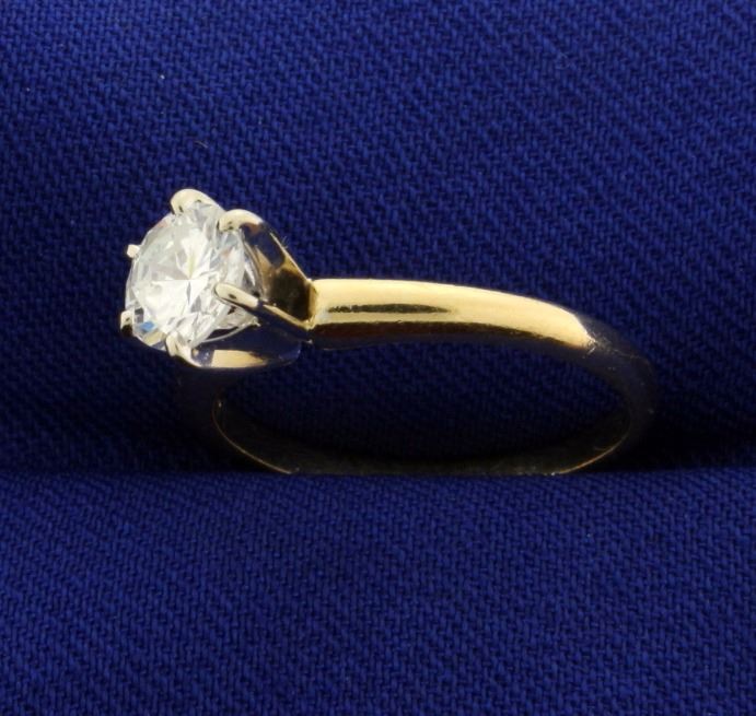 In 14k yellow and white gold. Diamond is a round brilliant diamond with very high quality. A clarity of VS and a color of H. Size 5. 2.2g.
