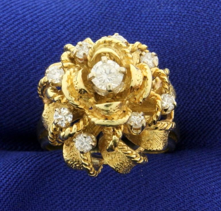 In 14k yellow gold. Contains one high quality .25ct diamond surrounded by eight .05ct high quality diamonds, all SI clarity/G color. Size 6 1/2. 12.1g.