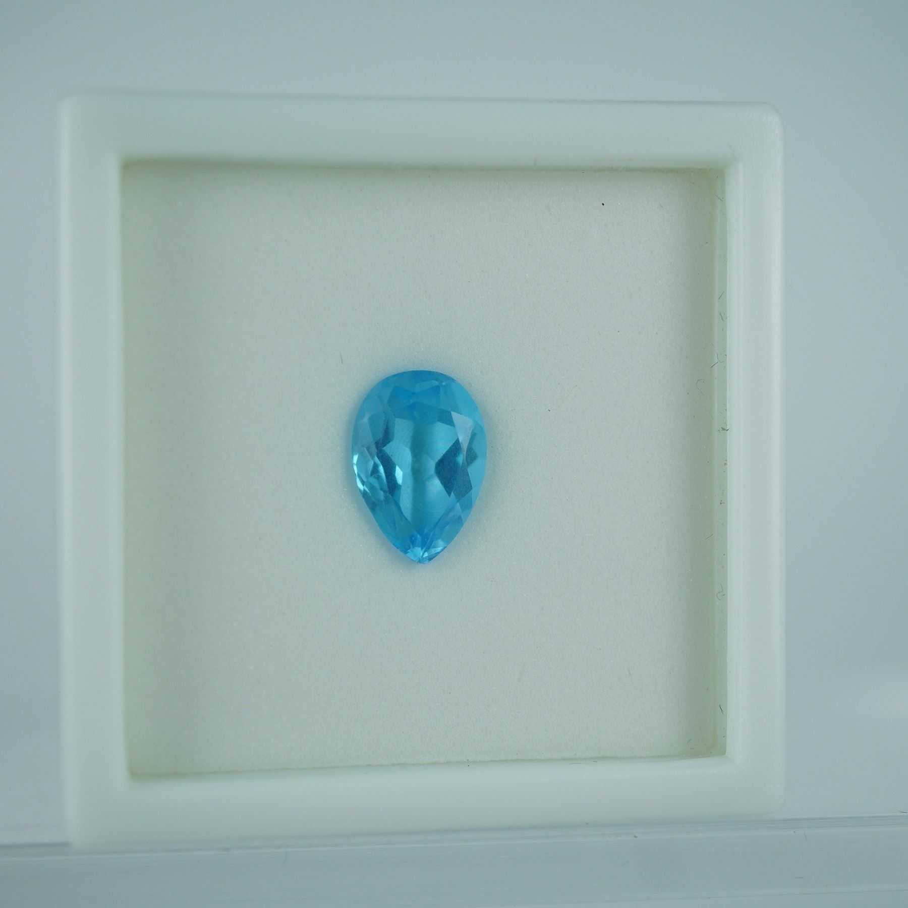 Brilliant pear cut Swiss Blue Topaz gemstone weighing approximately 2.30 carats. This vibrant gemstone features a striking bright blue hue and is precision cut into a pear shape for maximum brilliance. A beautiful addition for collectors or jewelry design. Comes with a protective case.
