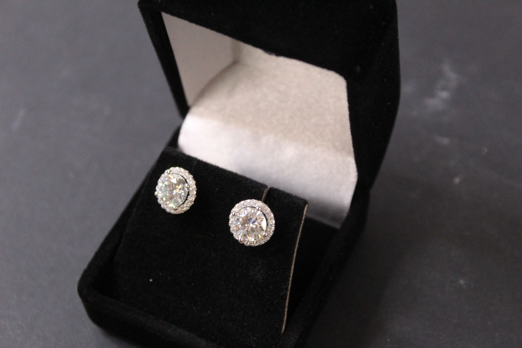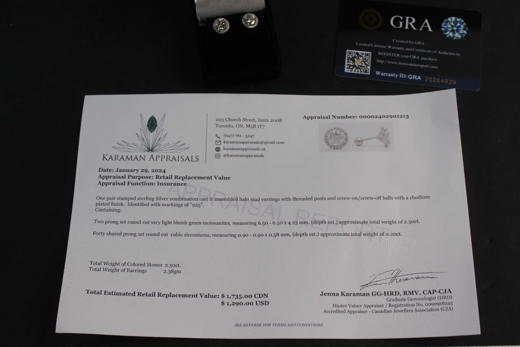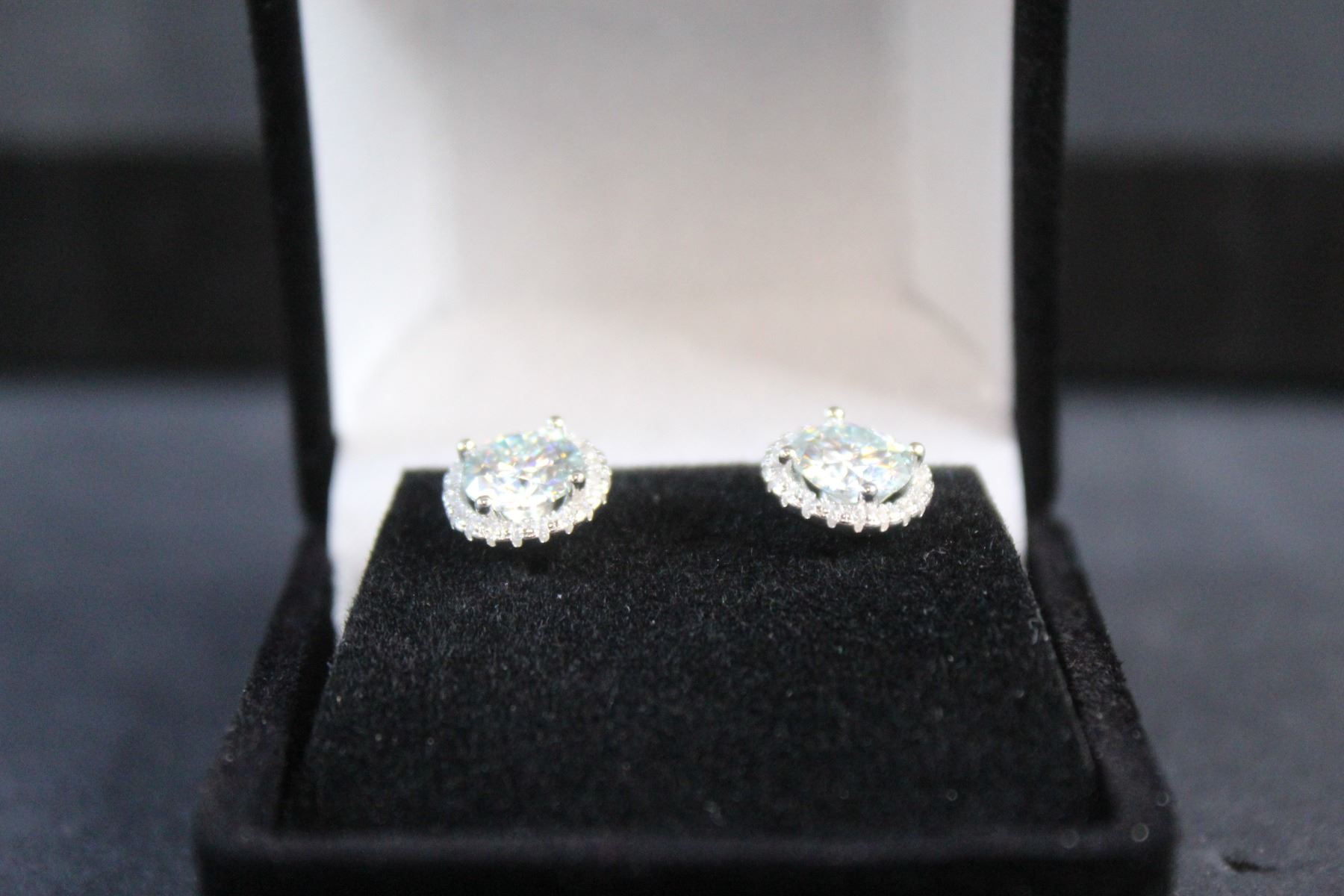 ^2.30 CT TW Round Brilliant Cut Moissanite VVS D Color Set in Center of Round Halo with 40 Round Cut Cubic Zirconium Weighing a Total 0.20 CT Set in 925 Silver Earrings with Screw Backs - Retail Value $1735