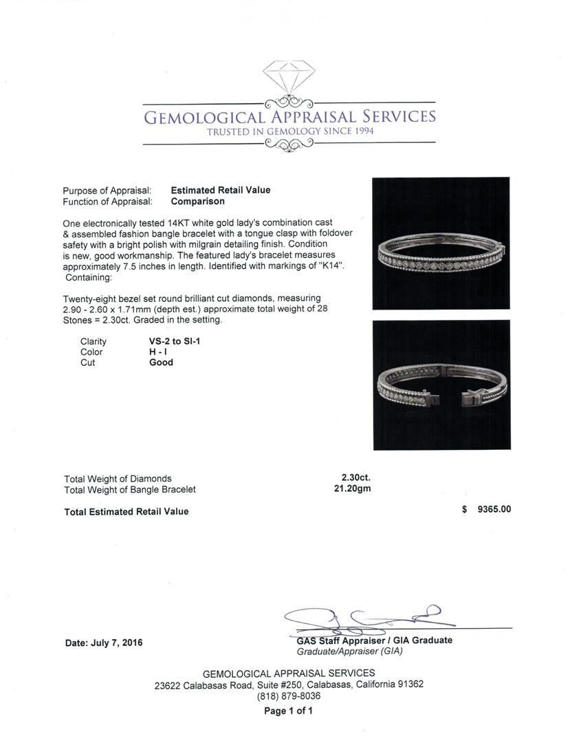 One electronically tested 14KT white gold lady's combination cast & assembled fashion bangle bracelet with a tongue clasp with fold over safety with a bright polish with milgrain detailing finish. The featured lady's bracelet measures approximately 7.5 inches in length. Identified with markings of "K14". Condition is new, good workmanship. Containing: Twenty-Eight bezel set round brilliant cut diamonds, measuring 2.90 - 2.60 x 1.71mm (depth est.) approximate total weight of 28 Stones = 2.30ct. Graded in the setting. Clarity: VS-2 to SI-1. Color: H - I. Cut Good. Total Weight of Diamonds 2.30ct. Total Weight of Bangle Bracelet 21.20gm. GAS Appraised at $9,365.00.