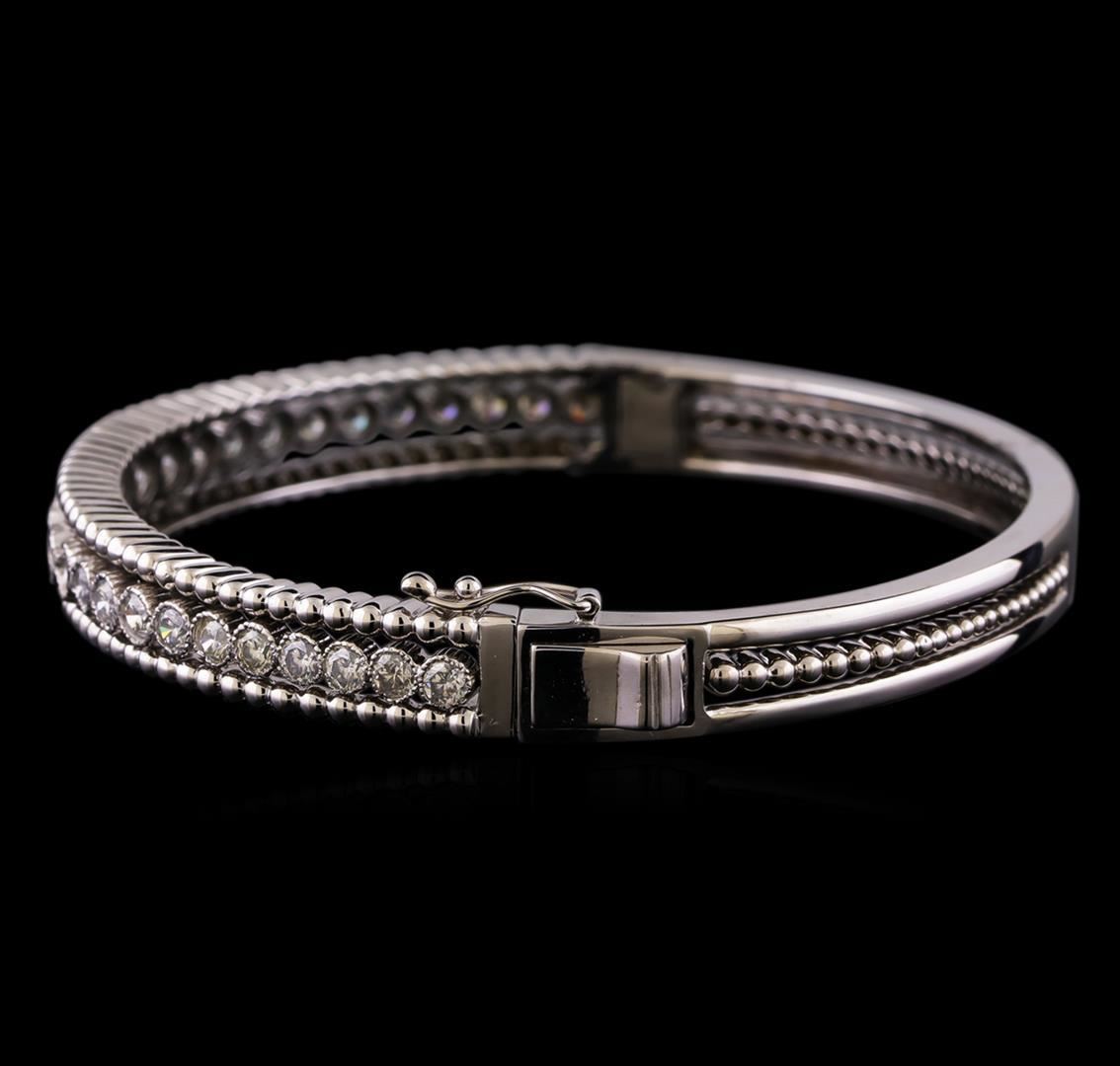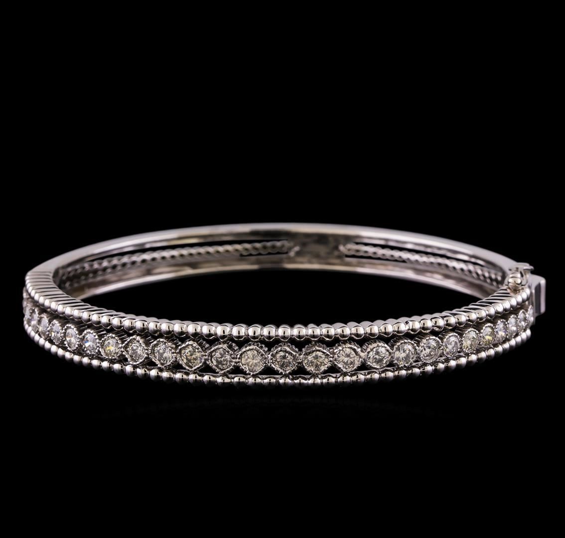 One electronically tested 14KT white gold lady's combination cast & assembled fashion bangle bracelet with a tongue clasp with fold over safety with a bright polish with milgrain detailing finish. The featured lady's bracelet measures approximately 7.5 inches in length. Identified with markings of "K14". Condition is new, good workmanship. Containing: Twenty-Eight bezel set round brilliant cut diamonds, measuring 2.90 - 2.60 x 1.71mm (depth est.) approximate total weight of 28 Stones = 2.30ct. Graded in the setting. Clarity: VS-2 to SI-1. Color: H - I. Cut Good. Total Weight of Diamonds 2.30ct. Total Weight of Bangle Bracelet 21.20gm. GAS Appraised.