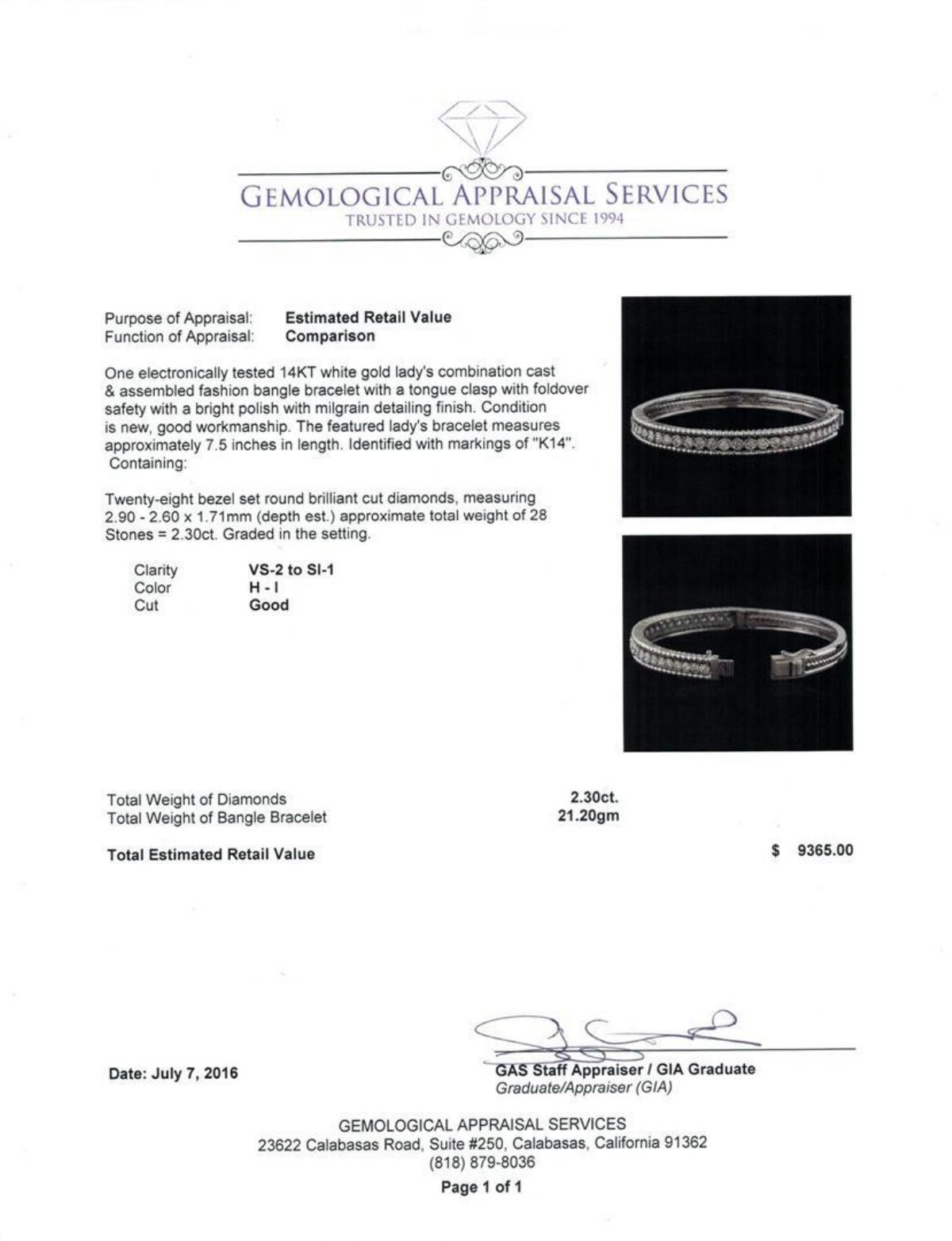One electronically tested 14KT white gold lady's combination cast & assembled fashion bangle bracelet with a tongue clasp with fold over safety with a bright polish with milgrain detailing finish. The featured lady's bracelet measures approximately 7.5 inches in length. Identified with markings of "K14". Condition is new, good workmanship. Containing: Twenty-Eight bezel set round brilliant cut diamonds, measuring 2.90 - 2.60 x 1.71mm (depth est.) approximate total weight of 28 Stones = 2.30ct. Graded in the setting. Clarity: VS-2 to SI-1. Color: H - I. Cut Good. Total Weight of Diamonds 2.30ct. Total Weight of Bangle Bracelet 21.20gm. GAS Appraised.