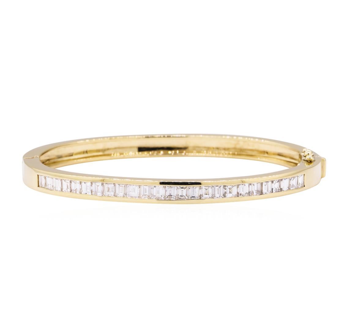 One electronically tested 14KT yellow gold lady's combination cast & assembled fashion bangle bracelet with a tongue clasp with foldover safety with a bright polish finish. The featured lady's bangle bracelet measures approximately six and a half inches in circumference with a width of five millimeters. Condition is new, good workmanship. Containing: Twenty-Five channel set baguette cut diamonds, measuring from 2.60 x 2.00 x 1.60mm (depth est.) to 2.80 x 2.30 x 1.84mm (depth est.) approximate total weight of 25 Stones = 2.30ct. Graded in the setting. Color F - G Clarity VVS-2 to VS-1 Cut Excellent. Total Weight of Diamonds 2.30ct.. Total Weight of Bangle Bracelet 20.70gm GAS Appraised at  $8810.00. GAS Appraised at $8,850.00.