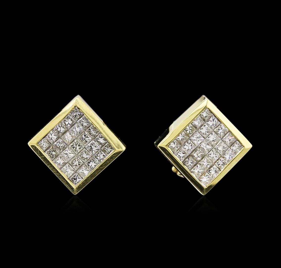 One pair electronically tested 18KT yellow gold ladies cast & assembled diamond earrings with lever backs. Each earring features a gallery of princess cut diamonds. Condition is good. Containing: Fifty invisible set princess cut diamonds, measuring 2.00 x 2.00 x 1.40mm (depth est.) approximate total weight of 50 Stones = 2.30ct. Graded in the setting. Clarity: VS-1 to SI-1. Color: G - I. Total Weight of Diamonds 2.30ct. Total Weight of Earrings 11.34gm. AIG Appraised at $7,790.00.