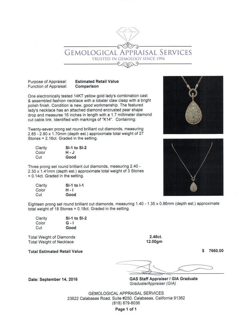One electronically tested 14KT yellow gold lady's combination cast & assembled fashion necklace with a lobster claw clasp with a bright polish finish. The featured lady's necklace has an attached diamond encrusted pear shape drop and measures 16 inches in length with a 1.7 millimeter diamond cut cable link. Identified with markings of 'K14'. Condition is new, good workmanship. Containing: Twenty-Seven prong set round brilliant cut diamonds, measuring 2.85 - 2.80 x 1.70mm (depth est.) approximate total weight of 27 Stones = 2.16ct. Graded in the setting. Clarity SI-1 to SI-2. Color: H - J Cut Good Three prong set round brilliant cut diamonds, measuring 2.40 - 2.30 x 1.41mm (depth est.) approximate total weight of 3 Stones = 0.14ct. Graded in the setting. Clarity SI-1 to I-1. Color: H - I Cut Good Eighteen prong set round brilliant cut diamonds, measuring 1.40 - 1.35 x 0.86mm (depth est.) approximate total weight of 18 Stones = 0.18ct. Graded in the setting. Clarity SI-1 to SI-2. Color: G - I Cut Good. Total Weight of Diamonds 2.48ct.. Total Weight of Necklace 12.00gm GAS Appraised.