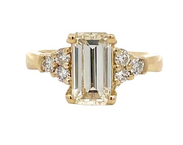 One electronically tested 14KT yellow gold lady's cast fashion wedding ring with a cathedral tapered shank with a bright polish finish. The featured lady's ring has a shank measuring 2.60 millimeters wide. Identified with markings of "14K". Condition is new, good workmanship. Containing: One prong set emerald cut diamond, measuring 9.85 x 5.25 x 3.60mm (depth est.), 5.00% GTCF approximate weight of 2.00ct. Graded in the setting. Color I Clarity VS-1 Cut Very Good Six prong set round brilliant cut diamonds, measuring 2.40 - 2.30 x 1.46mm (depth est.) approximate total weight of 6 Stones = 0.30ct. Graded in the setting. Color G - H Clarity VS-2 to SI-1 Cut Very Good Total Weight of Diamonds 2.30ct. Total Weight of Wedding Ring 4.50gm