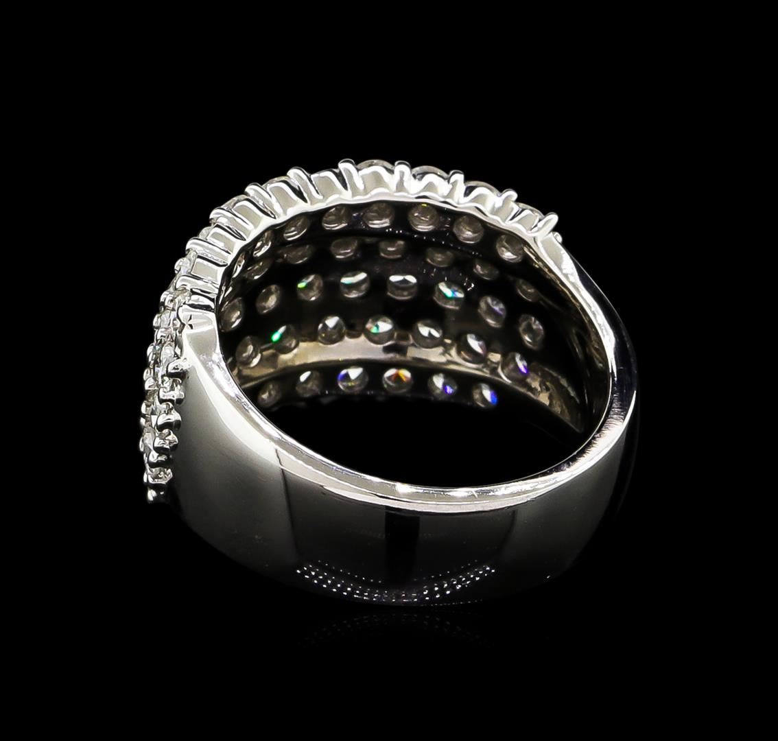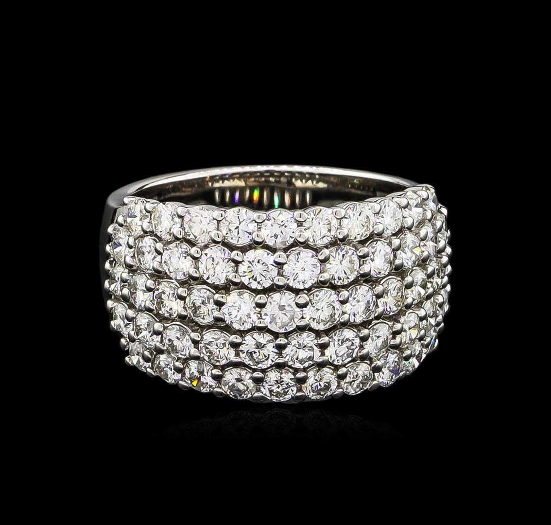 One electronically tested 14KT white gold lady's cast fashion ring with a tapered shank with a bright polish finish. The featured lady's ring has a five row motif and a shank measuring 5.91 millimeters wide. Identified with markings of "14K". Condition is new, good workmanship. Containing: Fifty-Four prong set round brilliant cut diamonds, measuring 2.40 - 2.20 x 1.38mm (depth est.) approximate total weight of 54 Stones = 2.30ct. Graded in the setting. Clarity: VS-2 to SI-2. Color: G - I. Cut Very Good. Total Weight of Diamonds 2.30ct. Total Weight of Ring 9.00gm. GAS Appraised at $7,465.00.