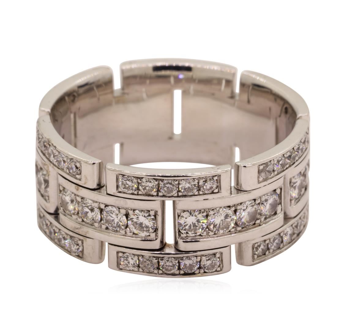One electronically tested 14KT white gold man's cast eternity wedding band with a bright polish finish. The featured man's ring has a six section bar link motif and a shank measuring 9.55 millimeters wide. Condition is like new. Containing: Twenty-Four prong set round brilliant cut diamonds, measuring 2.50 - 2.45 x 1.54mm (depth est.) approximate total weight of 24 Stones = 1.40ct. Graded in the setting. Color H - I Clarity VS-2 to SI-1 Cut Good Sixty prong set round brilliant cut diamonds, measuring 1.60 - 1.55 x 0.98mm (depth est.) approximate total weight of 60 Stones = 0.90ct. Graded in the setting. Color H - I Clarity SI-1 to SI-2 Cut Good. Total Weight of Diamonds 2.30ct.. Total Weight of Band 9.20gm GAS Appraised at $5700.00. GAS Appraised at $5,700.00.