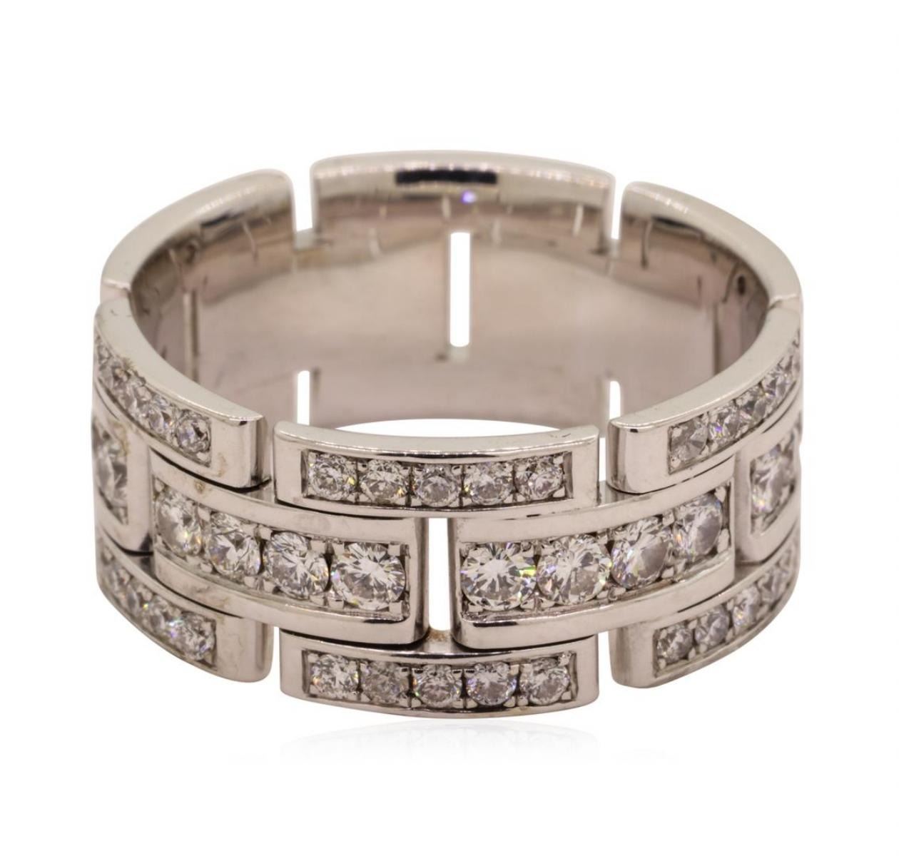 One electronically tested 14KT white gold man's cast eternity wedding band with a bright polish finish. The featured man's ring has a six section bar link motif and a shank measuring 9.55 millimeters wide. Condition is like new. Containing: Twenty-Four prong set round brilliant cut diamonds, measuring 2.50 - 2.45 x 1.54mm (depth est.) approximate total weight of 24 Stones = 1.40ct. Graded in the setting. Color H - I Clarity VS-2 to SI-1 Cut Good Sixty prong set round brilliant cut diamonds, measuring 1.60 - 1.55 x 0.98mm (depth est.) approximate total weight of 60 Stones = 0.90ct. Graded in the setting. Color H - I Clarity SI-1 to SI-2 Cut Good. Total Weight of Diamonds 2.30ct.. Total Weight of Band 9.20gm GAS Appraised at $5700.00. GAS Appraised.
