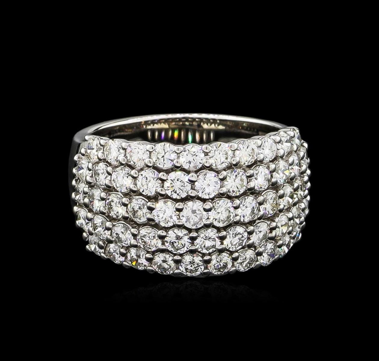 One electronically tested 14KT white gold lady's cast fashion ring with a tapered shank with a bright polish finish. The featured lady's ring has a five row motif and a shank measuring 5.91 millimeters wide. Identified with markings of "14K". Condition is new, good workmanship. Containing: Fifty-Four prong set round brilliant cut diamonds, measuring 2.40 - 2.20 x 1.38mm (depth est.) approximate total weight of 54 Stones = 2.30ct. Graded in the setting. Clarity: VS-2 to SI-2. Color: G - I. Cut Very Good. Total Weight of Diamonds 2.30ct. Total Weight of Ring 9.00gm. GAS Appraised.