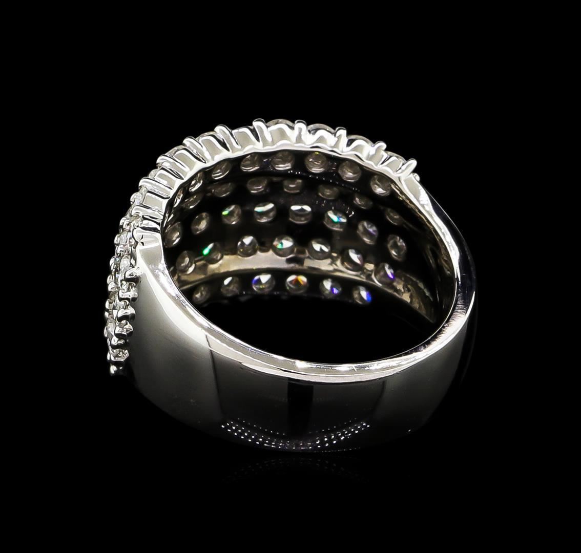 One electronically tested 14KT white gold lady's cast fashion ring with a tapered shank with a bright polish finish. The featured lady's ring has a five row motif and a shank measuring 5.91 millimeters wide. Identified with markings of "14K". Condition is new, good workmanship. Containing: Fifty-Four prong set round brilliant cut diamonds, measuring 2.40 - 2.20 x 1.38mm (depth est.) approximate total weight of 54 Stones = 2.30ct. Graded in the setting. Clarity: VS-2 to SI-2. Color: G - I. Cut Very Good. Total Weight of Diamonds 2.30ct. Total Weight of Ring 9.00gm. GAS Appraised.