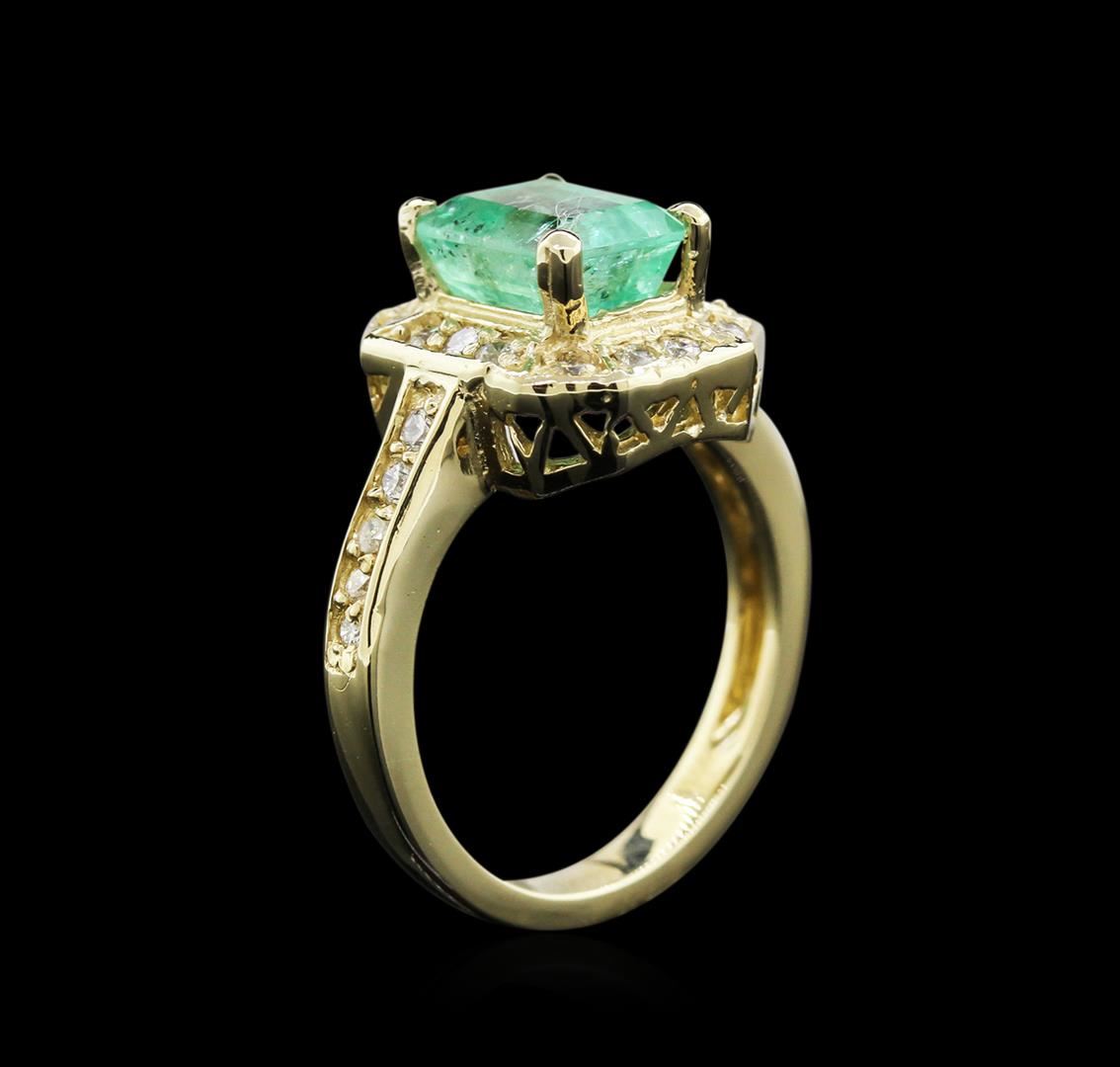 One electronically tested 14KT yellow gold lady's cast fashion ring with a halo with a bright polish finish. The featured lady's ring has a 2.64 millimeter wide shank. Condition is new, good workmanship. Containing: One prong set emerald step cut natural emerald, measuring 8.58 x 6.90 x 5.39mm, approximate weight of 2.30ct., clarity is slightly included, type III, medium light, very slightly grayish, very slightly bluish green color, (GIA vslbG 4/3), cut is good. Transmitting light with a minimum of distortion, transparent. Naturally occurring internal & external characteristics are present. Indications of oil residue. Graded in the setting. Twenty-Four prong set round brilliant cut diamonds, measuring 1.70 - 1.65 x 1.04mm (depth est.) approximate total weight of 24 Stones = 0.44ct. Graded in the setting. Clarity: SI-1 to I-1. Color: H - I. Cut Good. Total Weight of Colored Stones 2.30ct. Total Weight of Diamonds 0.44ct. Total Weight of Ring 6.00gm. GAS Appraised at $5,130.00.
