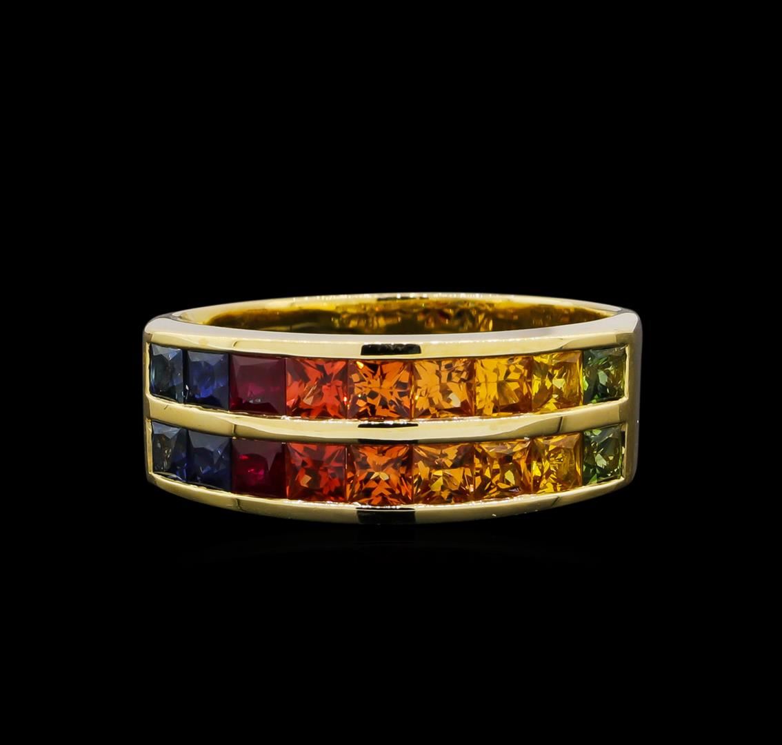 One electronically tested 14KT yellow gold lady's cast fashion ring with a two row wide band with a bright polish finish. The featured lady's ring has a shank measuring 3.45 millimeters in width. Identified with markings of "14K". Condition is new, good workmanship. Containing: Eighteen channel set princess modified brilliant cut natural multi-color sapphires, measuring 2.60 x 2.50 x 1.88mm, (depth est.) approximate total weight of 2.30ct., clarity is eye clean (Gem Dialogue The hue ranges from blue to red to orange to yellow to green.), cut is very good. Transmitting light with no distortion, transparent. Colored gemstones are presumed to have been subjected to commonly used enhancement processes. Graded in the setting. Total Weight of Colored Stones 2.30ct. Total Weight of Ring 5.10gm. GAS Appraised at $2,685.00.