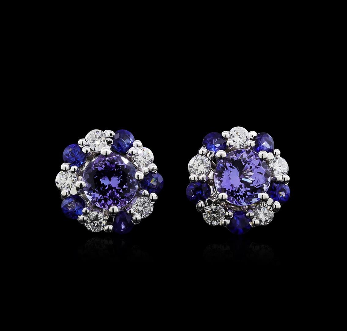 One pair of earrings featuring: 14KT white gold weighing 4.10 grams containing 2 tanzanites with a total weight of 1.02ct and 10 blue sapphires with a total weight of 1.02ct and diamonds with a total weight of 0.65ct.
