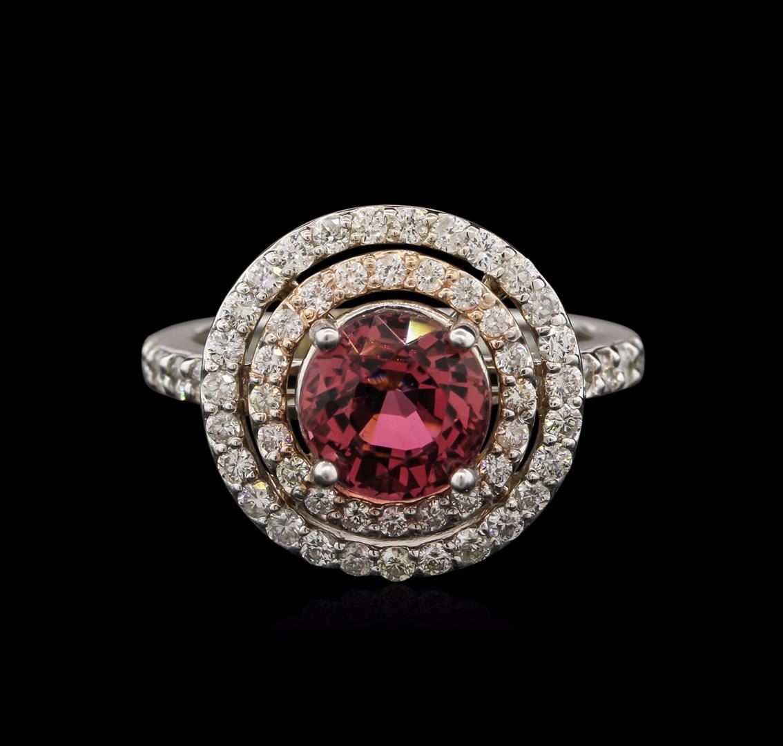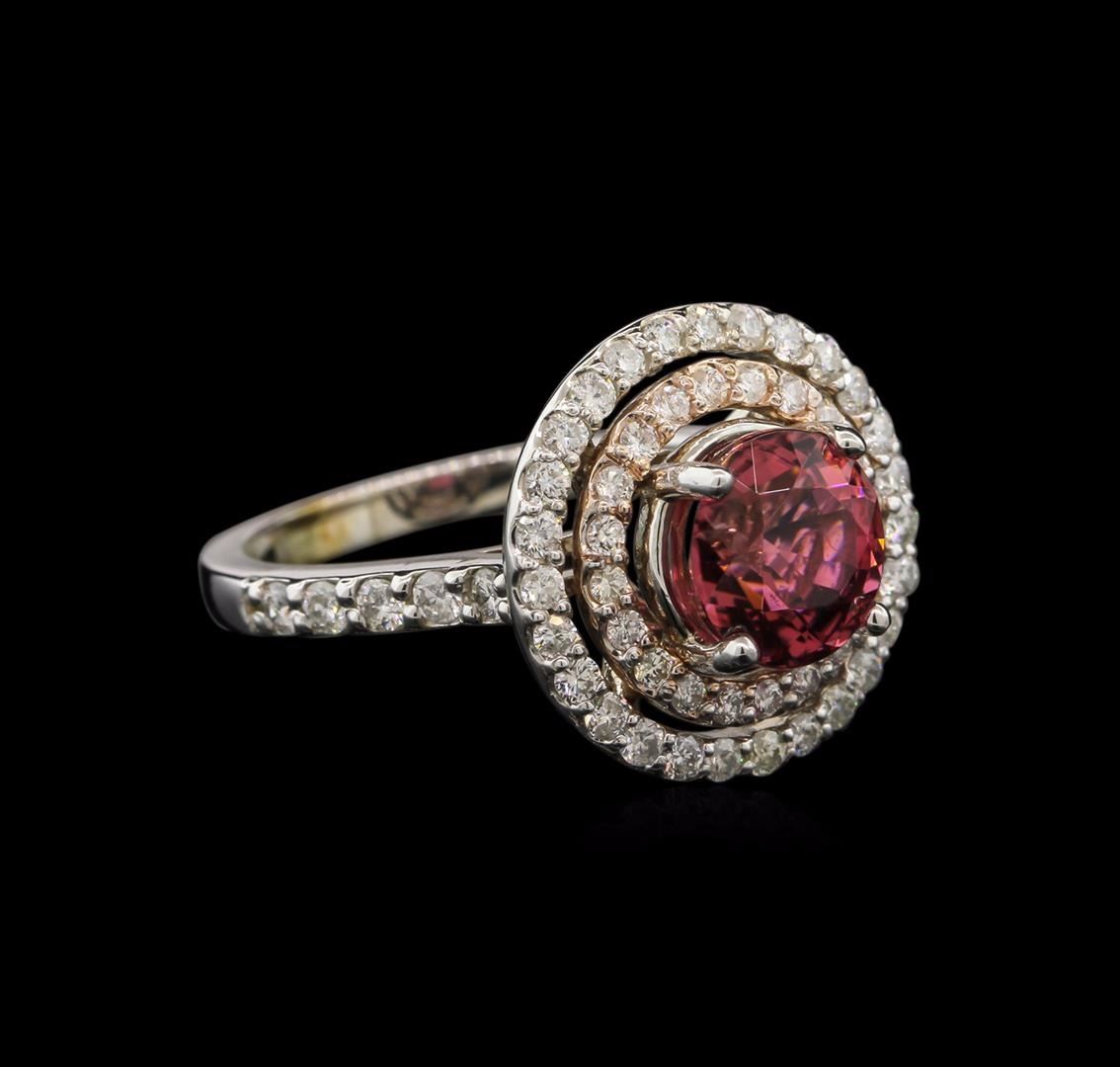 One electronically tested 14KT white gold ladies cast pink tourmaline and diamond ring with a bright polish finish. The featured pink tourmaline is set within tiered diamond bezels supported by diamond set shoulders, completed by a two millimeter wide band. Identified with markings of "K14". Condition is new, good workmanship. Containing: One prong set round brilliant cut natural pink tourmaline exact weight 2.30ct., extremely light Clarity is eye clean, medium dark, very slightly greyish, purplish pink color, (GIA pPi6/3), cut is good. Transmitting light with no distortion, transparent. Graded in the setting. Fifty-Seven prong set round brilliant cut diamonds exact total weight 57 Stones = 0.84ct. Graded in the setting. Clarity: SI-2 to I-1. Color: G - I. Total Weight of Colored Stones 2.30ct. Total Weight of Diamonds 0.84ct. Total Weight of Ring 5.43gm. AIG Appraised at $3,950.00.
