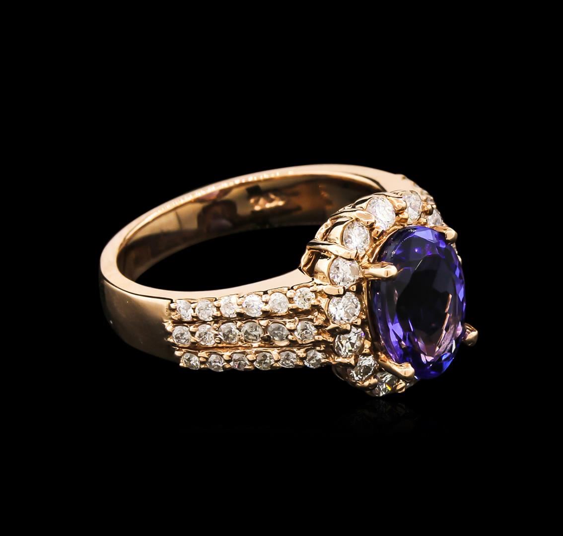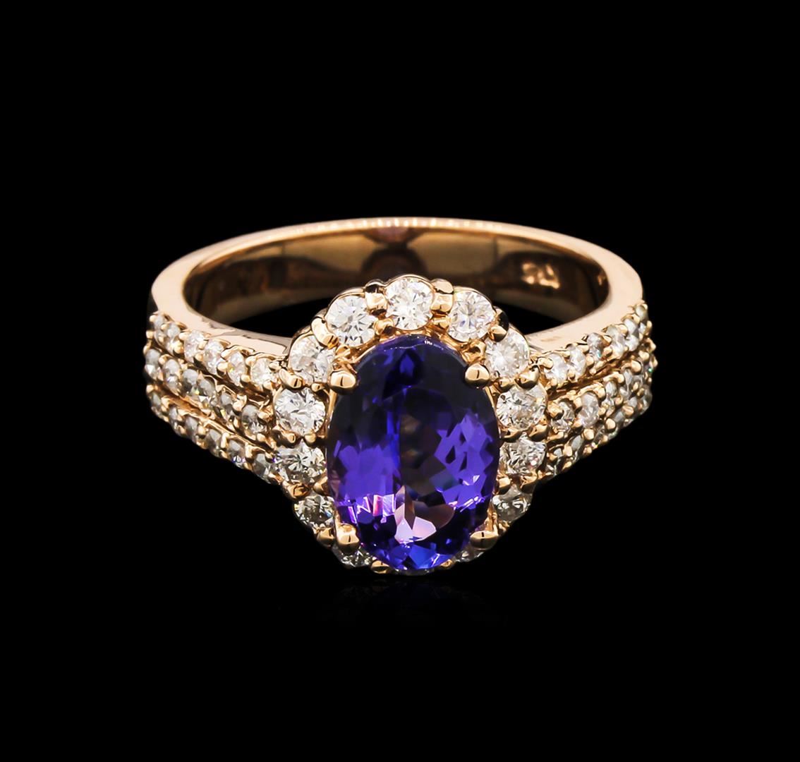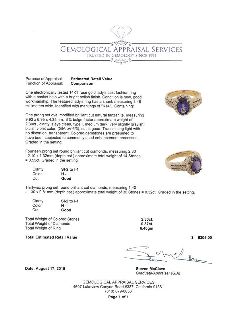 One electronically tested 14KT rose gold lady's cast fashion ring with a basket halo with a bright polish finish. The featured lady's ring has a shank measuring 3.48 millimeters wide. Identified with markings of "K14". Condition is new, good workmanship. Containing: One prong set oval modified brilliant cut natural tanzanite, measuring 9.93 x 6.95 x 4.35mm, 5% bulge factor, approximate weight of 2.30ct., clarity is eye clean, type I, medium dark, very slightly grayish, bluish violet color, (GIA bV 6/3), cut is good. Transmitting light with no distortion, transparent. Colored gemstones are presumed to have been subjected to commonly used enhancement processes. Graded in the setting. Fourteen prong set round brilliant cut diamonds, measuring 2.30 - 2.10 x 1.32mm (depth est.) approximate total weight of 14 Stones = 0.55ct. Graded in the setting. Clarity: SI-2 to I-1. Color: H - I. Cut Good Thirty-Six prong set round brilliant cut diamonds, measuring 1.40 - 1.30 x 0.81mm (depth est.) approximate total weight of 36 Stones = 0.32ct. Graded in the setting. Clarity: SI-2 to I-1. Color: H - I. Cut Good. Total Weight of Colored Stones 2.30ct. Total Weight of Diamonds 0.87ct. Total Weight of Ring 6.40gm. GAS Appraised at $6,305.00.