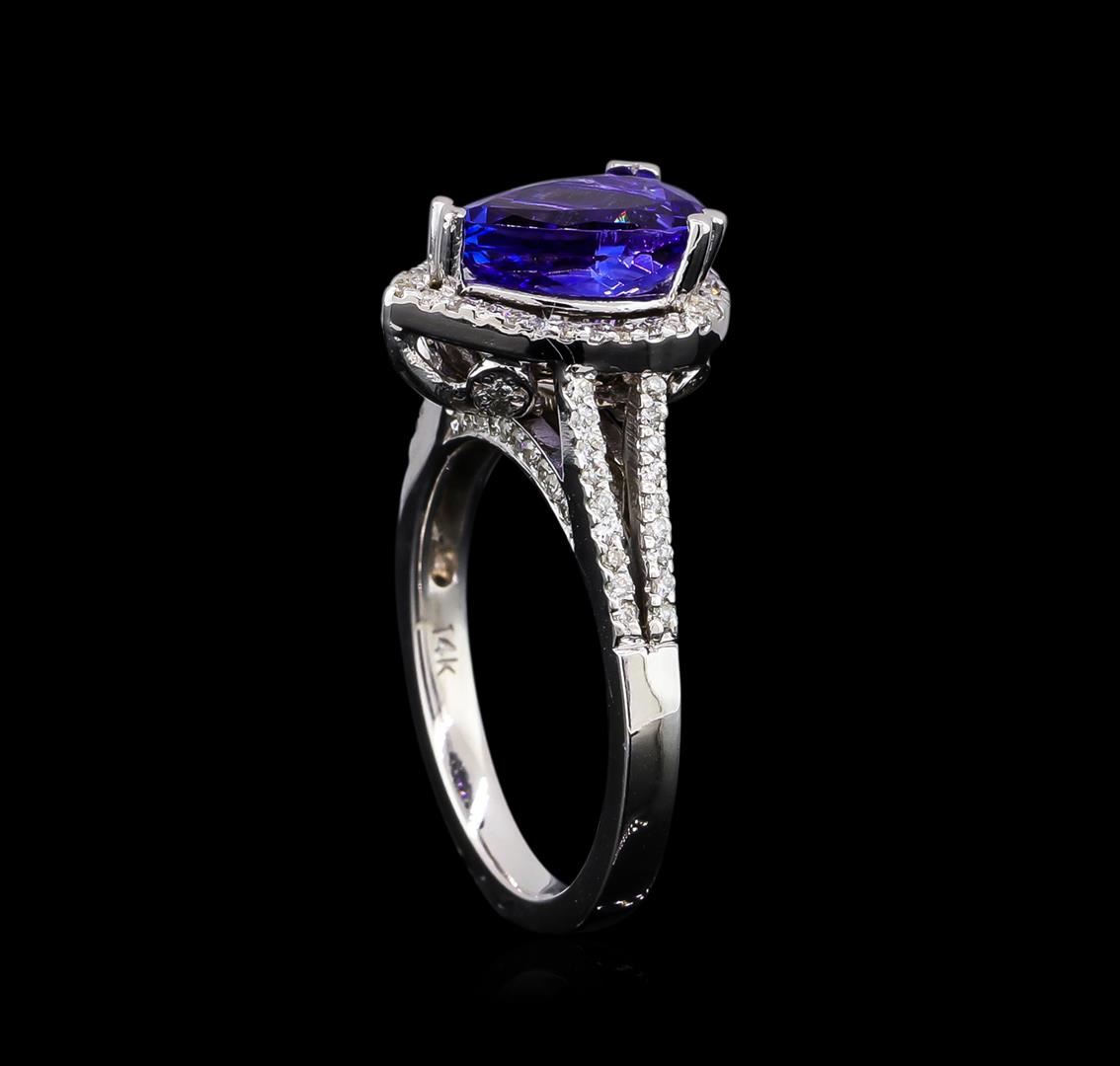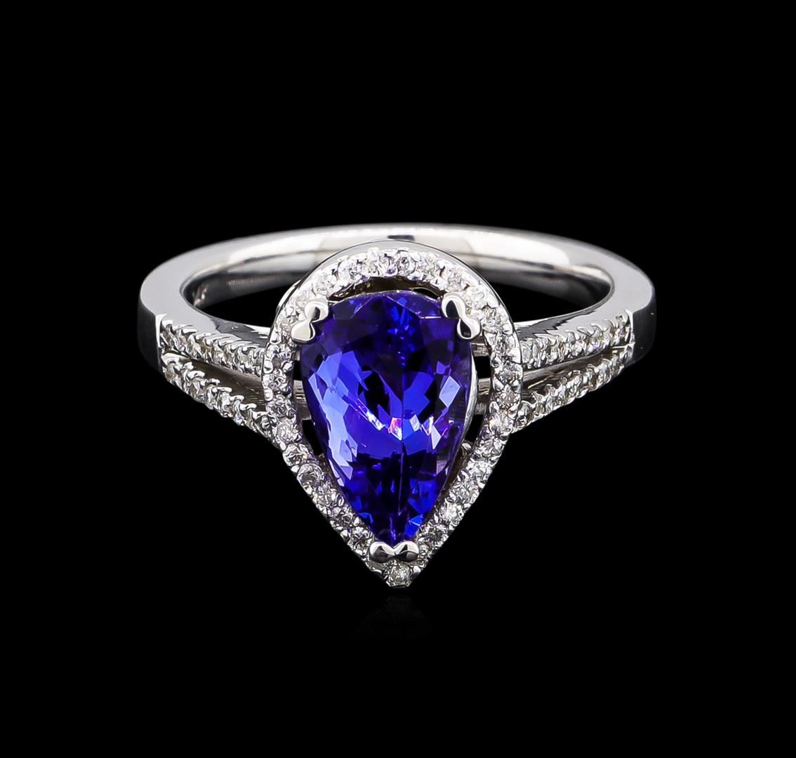 One electronically tested 14KT white gold lady's cast fashion ring with a cathedral shank with a halo with a bright polish finish. The featured lady's ring has a shank measuring 2.22 millimeters wide. Identified with markings of "14K". Condition is new, good workmanship. Containing: One prong set pear modified brilliant cut natural tanzanite, measuring 10.45 x 6.88 x 4.74mm, approximate weight of 2.30ct., clarity is eye clean, type I, medium dark, moderately strong, violetish blue color, (GIA vB 6/4), cut is very good. Transmitting light with no distortion, transparent. Colored gemstones are presumed to have been subjected to commonly used enhancement processes. Graded in the setting. Five prong set round brilliant cut diamonds, measuring 1.50 - 1.40 x 0.87mm (depth est.) approximate total weight of 5 Stones = 0.05ct. Graded in the setting. Clarity: SI-1 to I-1. Color: H - I. Cut Good Ninety-Six prong set round brilliant cut diamonds, measuring 1.15 - 1.00 x 0.68mm (depth est.) approximate total weight of 96 Stones = 0.50ct. Graded in the setting. Clarity: SI-2 to I-1. Color: H - I. Cut Good. Total Weight of Colored Stones 2.30ct. Total Weight of Diamonds 0.55ct. Total Weight of Ring 5.90gm. GAS Appraised at $6,485.00.