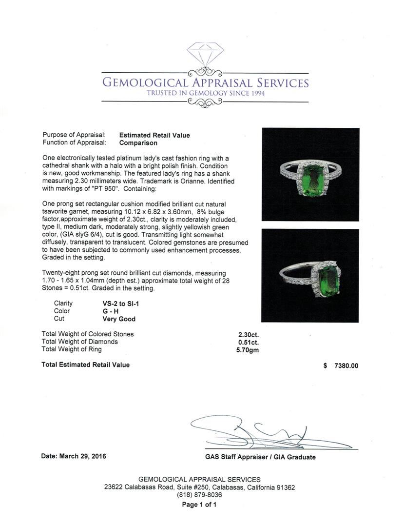 One electronically tested platinum lady's cast fashion ring with a cathedral shank with a halo with a bright polish finish. The featured lady's ring has a shank measuring 2.30 millimeters wide. Trademark is Orianne. Identified with markings of "PT 950". Condition is new, good workmanship. Containing: One prong set rectangular cushion modified brilliant cut natural tsavorite garnet, measuring 10.12 x 6.82 x 3.60mm, 8%. bulge factor, approximate weight of 2.30ct., clarity is moderately included, type II, medium dark, moderately strong, slightly yellowish green color, (GIA slyG 6/4), cut is good. Transmitting light somewhat diffusely, transparent to translucent. Colored gemstones are presumed to have been subjected to commonly used enhancement processes. Graded in the setting. Twenty-Eight prong set round brilliant cut diamonds, measuring 1.70 - 1.65 x 1.04mm (depth est.) approximate total weight of 28 Stones = 0.51ct. Graded in the setting. Clarity: VS-2 to SI-1. Color: G - Very Good. Total Weight of Colored Stones 2.30ct. Total Weight of Diamonds 0.51ct. Total Weight of Ring 5.70gm. GAS Appraised at $7,380.00.