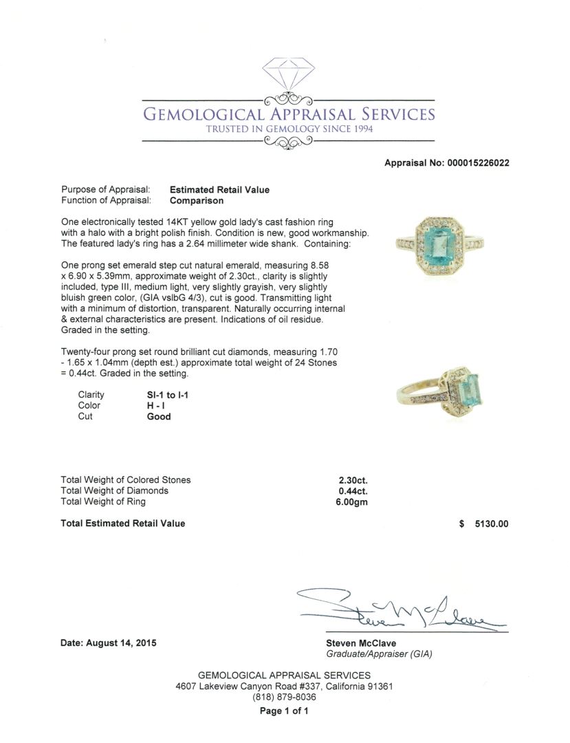 One electronically tested 14KT yellow gold lady's cast fashion ring with a halo with a bright polish finish. The featured lady's ring has a 2.64 millimeter wide shank. Condition is new, good workmanship. Containing: One prong set emerald step cut natural emerald, measuring 8.58 x 6.90 x 5.39mm, approximate weight of 2.30ct., clarity is slightly included, type III, medium light, very slightly grayish, very slightly bluish green color, (GIA vslbG 4/3), cut is good. Transmitting light with a minimum of distortion, transparent. Naturally occurring internal & external characteristics are present. Indications of oil residue. Graded in the setting. Twenty-Four prong set round brilliant cut diamonds, measuring 1.70 - 1.65 x 1.04mm (depth est.) approximate total weight of 24 Stones = 0.44ct. Graded in the setting. Clarity: SI-1 to I-1. Color: H - I. Cut Good. Total Weight of Colored Stones 2.30ct. Total Weight of Diamonds 0.44ct. Total Weight of Ring 6.00gm. GAS Appraised at $5,130.00.