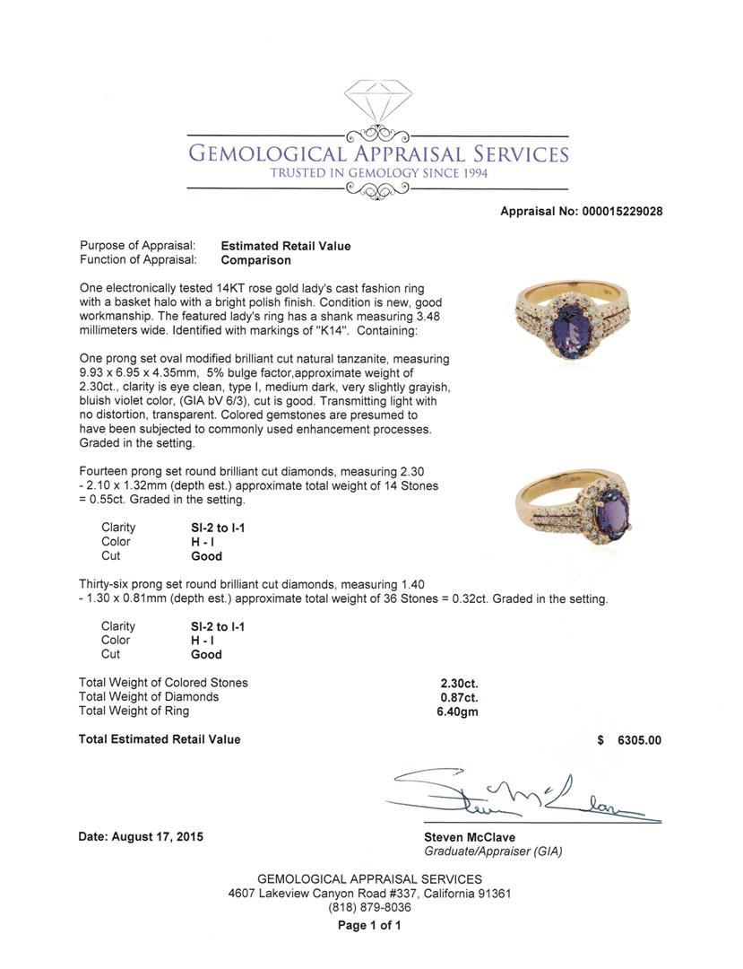 One electronically tested 14KT rose gold lady's cast fashion ring with a basket halo with a bright polish finish. The featured lady's ring has a shank measuring 3.48 millimeters wide. Identified with markings of "K14". Condition is new, good workmanship. Containing: One prong set oval modified brilliant cut natural tanzanite, measuring 9.93 x 6.95 x 4.35mm, 5% bulge factor, approximate weight of 2.30ct., clarity is eye clean, type I, medium dark, very slightly grayish, bluish violet color, (GIA bV 6/3), cut is good. Transmitting light with no distortion, transparent. Colored gemstones are presumed to have been subjected to commonly used enhancement processes. Graded in the setting. Fourteen prong set round brilliant cut diamonds, measuring 2.30 - 2.10 x 1.32mm (depth est.) approximate total weight of 14 Stones = 0.55ct. Graded in the setting. Clarity: SI-2 to I-1. Color: H - I. Cut Good Thirty-Six prong set round brilliant cut diamonds, measuring 1.40 - 1.30 x 0.81mm (depth est.) approximate total weight of 36 Stones = 0.32ct. Graded in the setting. Clarity: SI-2 to I-1. Color: H - I. Cut Good. Total Weight of Colored Stones 2.30ct. Total Weight of Diamonds 0.87ct. Total Weight of Ring 6.40gm. GAS Appraised at $6,305.00.
