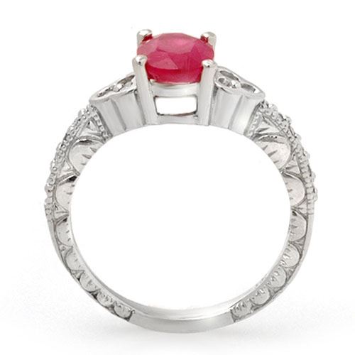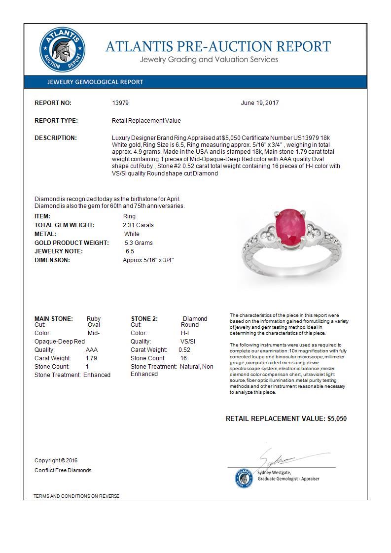 2.31 CTW Ruby & Diamond Ring 18K White Gold ---- Luxury Designer Brand Ring Appraised Retail Price at $5,050 ---- SKU Number US13979 18k White gold Ring Size is 6.5, Ring measuring approx. 5/16" x 3/4" , weighing in total approx. 4.9 grams. Made in the USA and is stamped 18k, Main stone 1.79 carat total weight containing 1 pieces of Mid-Opaque-Deep Red color with AAA quality Oval shape cut Ruby , Stone #2 0.52 carat total weight containing 16 pieces of H-I color with VS/SI quality Round shape cut